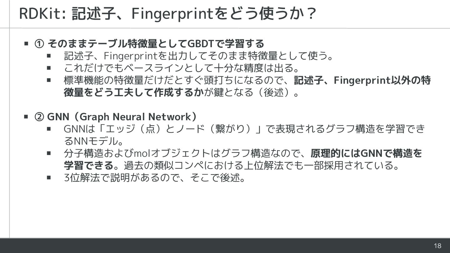 徴量をどう工夫して作成するかが鍵となる(後述)。 ▪ ② GNN(Graph Neural Network) ▪ GNNは「エッジ(点)とノード(繋がり)」で表現されるグラフ構造を学習でき るNNモデル。 ▪ 分子構造およびmolオブジェクトはグラフ構造なので、原理的にはGNNで構造を 学習できる。過去の類似コンペにおける上位解法でも一部採用されている。 ▪ 3位解法で説明があるので、そこで後述。 RDKit: 記述子、Fingerprintをどう使うか?