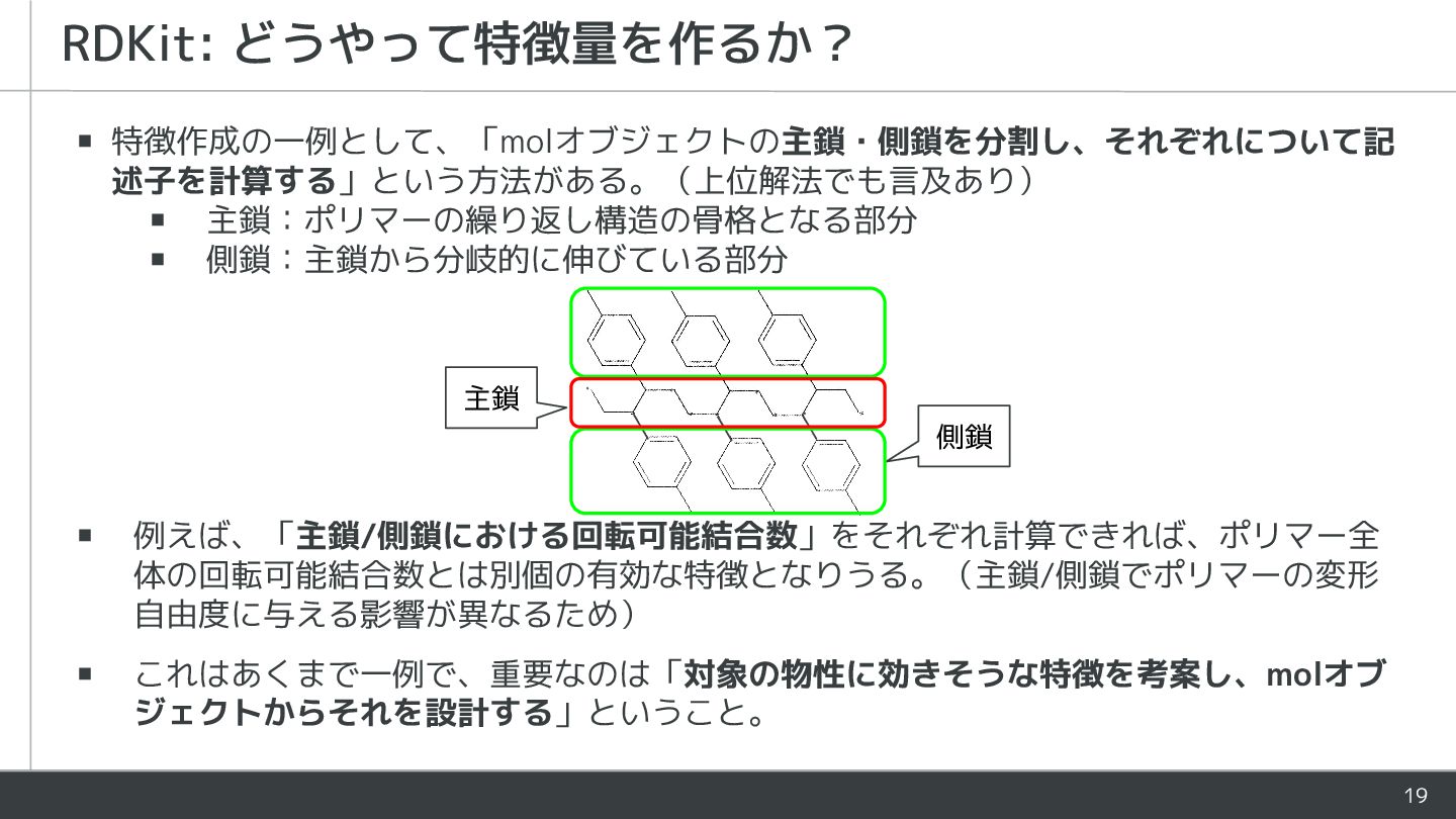▪ 側鎖:主鎖から分岐的に伸びている部分 ▪ 例えば、「主鎖/側鎖における回転可能結合数」をそれぞれ計算できれば、ポリマー全 体の回転可能結合数とは別個の有効な特徴となりうる。(主鎖/側鎖でポリマーの変形 自由度に与える影響が異なるため) ▪ これはあくまで一例で、重要なのは「対象の物性に効きそうな特徴を考案し、molオブ ジェクトからそれを設計する」ということ。