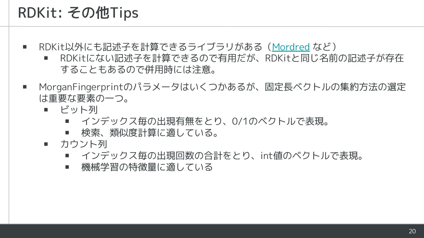 20 ▪ RDKit以外にも記述子を計算できるライブラリがある(Mordred など) ▪ RDKitにない記述子を計算できるので有用だが、RDKitと同じ名前の記述子が存在 することもあるので併用時には注意。 ▪ MorganFingerprintのパラメータはいくつかあるが、固定長ベクトルの集約方法の選定 は重要な要素の一つ。