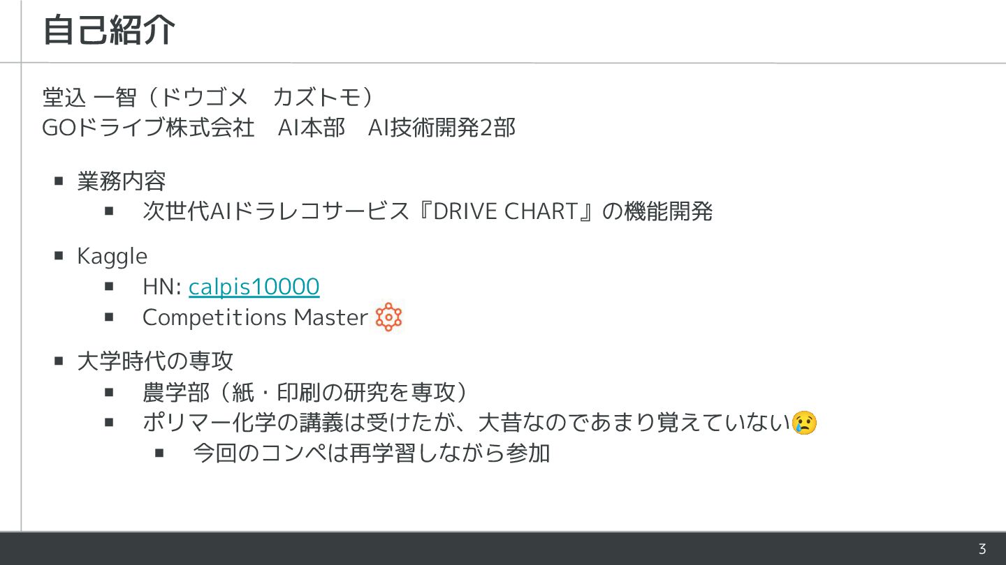 堂込 一智(ドウゴメ カズトモ) GOドライブ株式会社 AI本部 AI技術開発2部 ▪ 業務内容 ▪ 次世代AIドラレコサービス『DRIVE CHART』の機能開発 ▪ Kaggle
