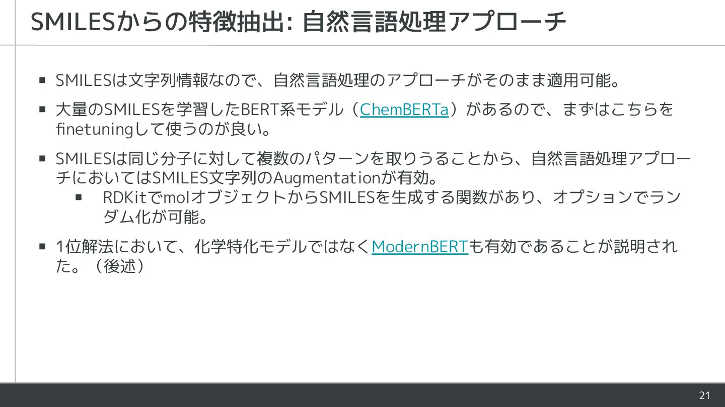 RDKitでmolオブジェクトからSMILESを生成する関数があり、オプションでラン ダム化が可能。 ▪ 1位解法において、化学特化モデルではなくModernBERTも有効であることが説明され た。(後述) SMILESからの特徴抽出: 自然言語処理アプローチ