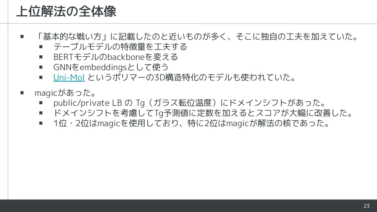 ▪ Uni-Mol というポリマーの3D構造特化のモデルも使われていた。 ▪ magicがあった。 ▪ public/private LB の Tg(ガラス転位温度)にドメインシフトがあった。 ▪ ドメインシフトを考慮してTg予測値に定数を加えるとスコアが大幅に改善した。 ▪ 1位・2位はmagicを使用しており、特に2位はmagicが解法の核であった。