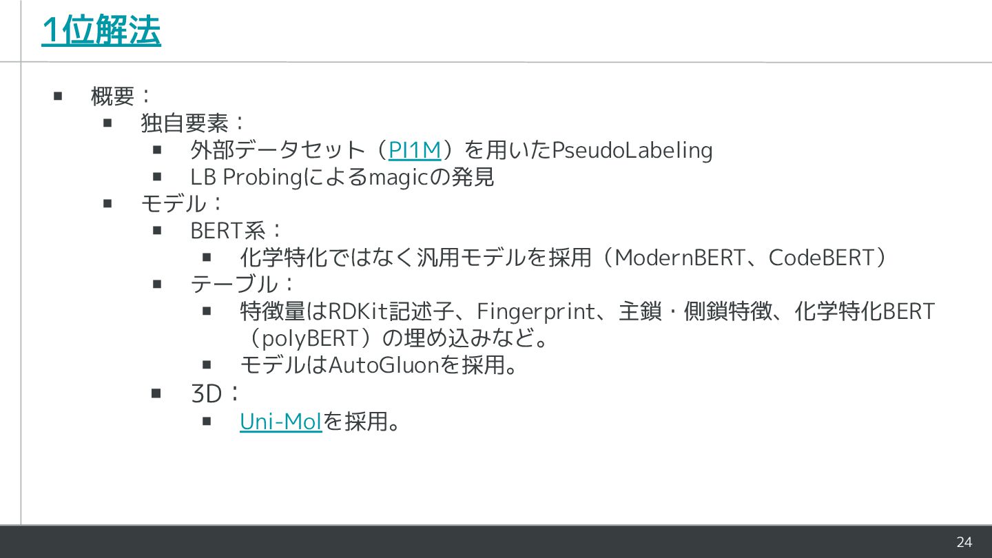 24 1位解法 ▪ 概要: ▪ 独自要素: ▪ 外部データセット(PI1M)を用いたPseudoLabeling ▪ LB