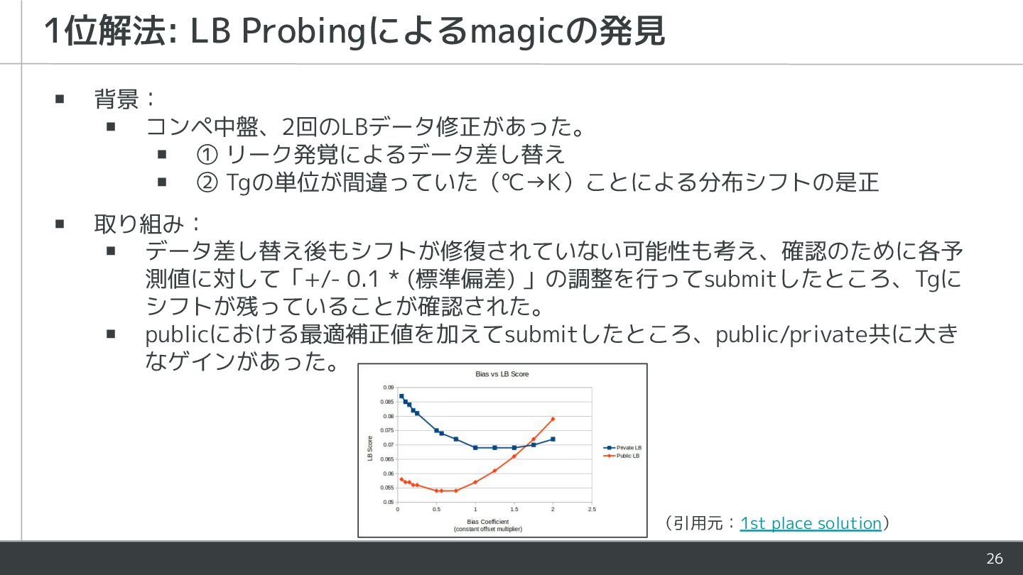 リーク発覚によるデータ差し替え ▪ ② Tgの単位が間違っていた(℃→K)ことによる分布シフトの是正 ▪ 取り組み: ▪ データ差し替え後もシフトが修復されていない可能性も考え、確認のために各予 測値に対して「+/- 0.1 * (標準偏差) 」の調整を行ってsubmitしたところ、Tgに シフトが残っていることが確認された。 ▪ publicにおける最適補正値を加えてsubmitしたところ、public/private共に大き なゲインがあった。 (引用元:1st place solution)