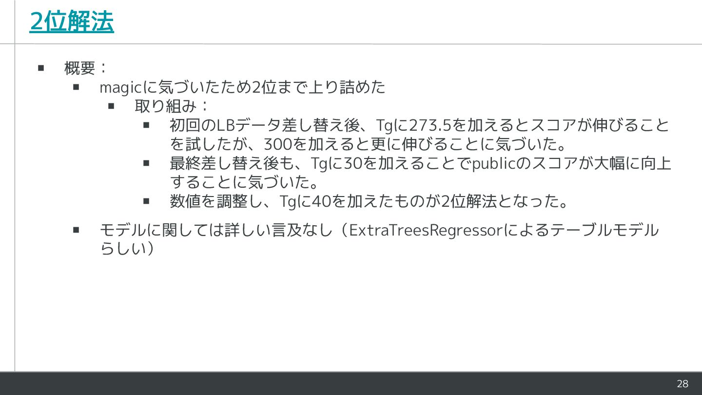 28 2位解法 ▪ 概要: ▪ magicに気づいたため2位まで上り詰めた ▪ 取り組み: ▪ 初回のLBデータ差し替え後、Tgに273.5を加えるとスコアが伸びること