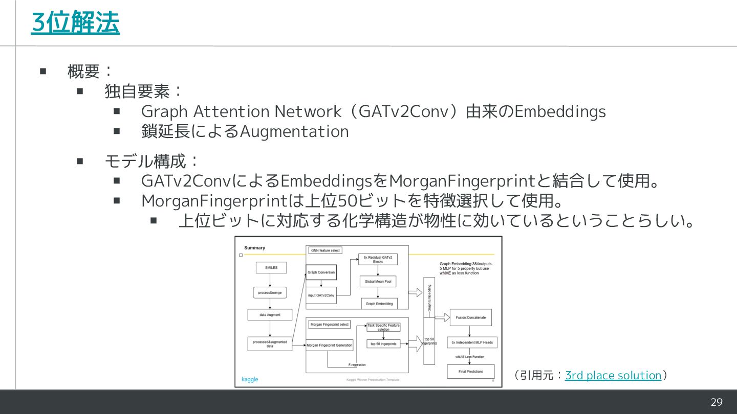 29 3位解法 ▪ 概要: ▪ 独自要素: ▪ Graph Attention Network(GATv2Conv)由来のEmbeddings