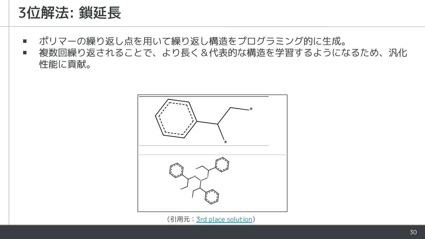 30 3位解法: 鎖延長 ▪ ポリマーの繰り返し点を用いて繰り返し構造をプログラミング的に生成。 ▪ 複数回繰り返されることで、より長く&代表的な構造を学習するようになるため、汎化 性能に貢献。 (引用元:3rd place