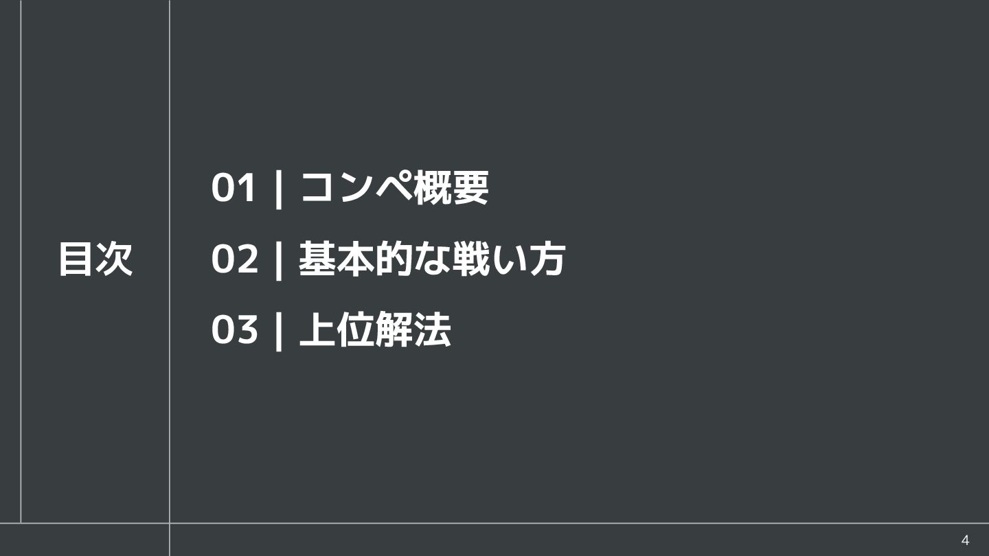 4 目次 01|コンペ概要 02|基本的な戦い方 03|上位解法