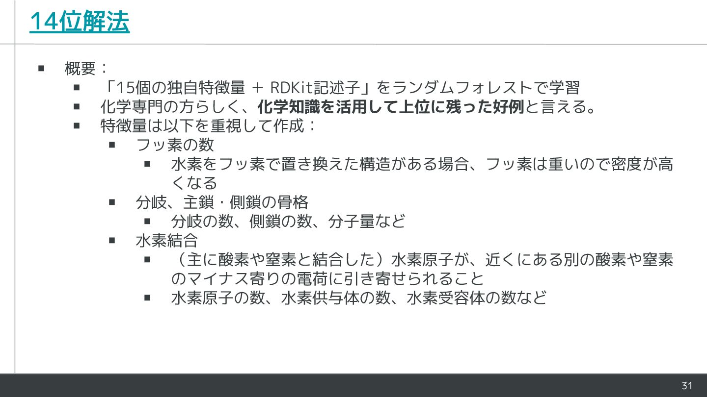 31 14位解法 ▪ 概要: ▪ 「15個の独自特徴量 + RDKit記述子」をランダムフォレストで学習 ▪ 化学専門の方らしく、化学知識を活用して上位に残った好例と言える。