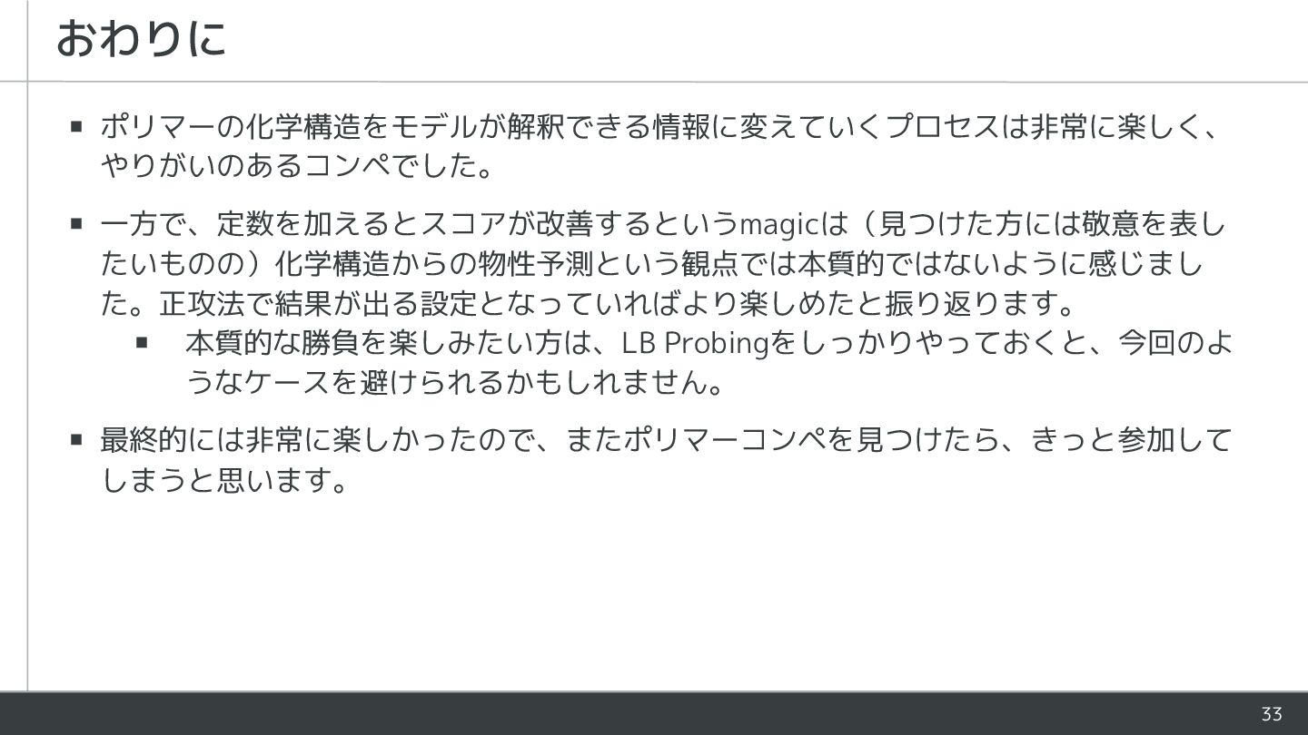 33 ▪ ポリマーの化学構造をモデルが解釈できる情報に変えていくプロセスは非常に楽しく、 やりがいのあるコンペでした。 ▪ 一方で、定数を加えるとスコアが改善するというmagicは(見つけた方には敬意を表し たいものの)化学構造からの物性予測という観点では本質的ではないように感じまし た。正攻法で結果が出る設定となっていればより楽しめたと振り返ります。 ▪ 本質的な勝負を楽しみたい方は、LB