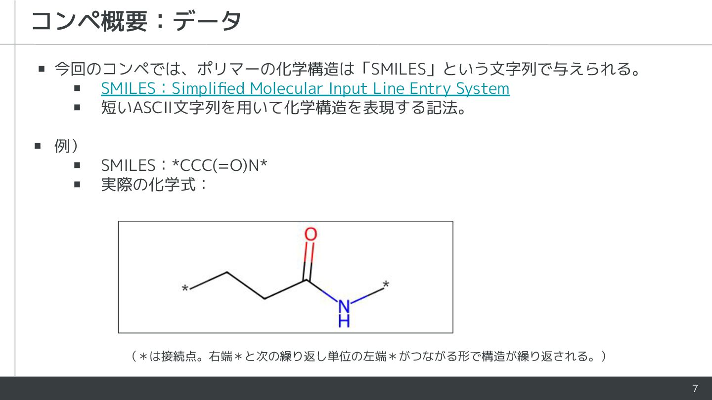 6 ▪ ポリマーの化学構造から5つの物性値を予測する。 ▪ 本来は実験やシミュレーションによって求めるが、労力が大きくて大変なので 機械学習を使って省力化したいというモチベーションらしい。 ▪ ポリマーとは? ▪ 小さな分子が鎖のように繋がって出来た大きな分子のこと。
