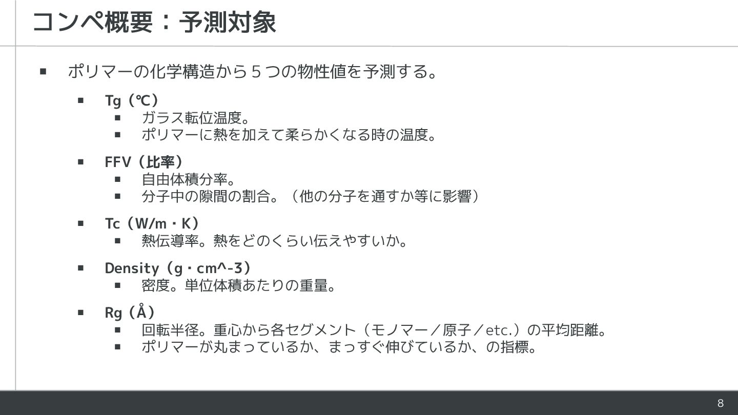 7 コンペ概要:データ ▪ 今回のコンペでは、ポリマーの化学構造は「SMILES」という文字列で与えられる。 ▪ SMILES:Simplified Molecular Input Line Entry