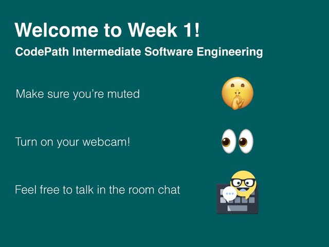 your webcam! Feel free to talk in the room chat CodePath Intermediate Software Engineering