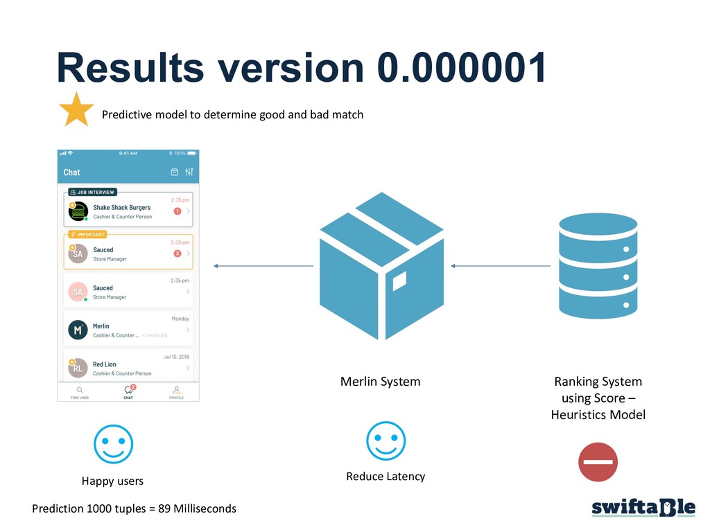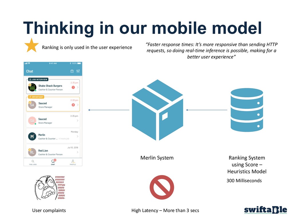 Score – Heuristics Model User complaints High Latency – More than 3 secs Ranking is only used in the user experience “Faster response times: It’s more responsive than sending HTTP requests, so doing real-time inference is possible, making for a better user experience” 300 Milliseconds
