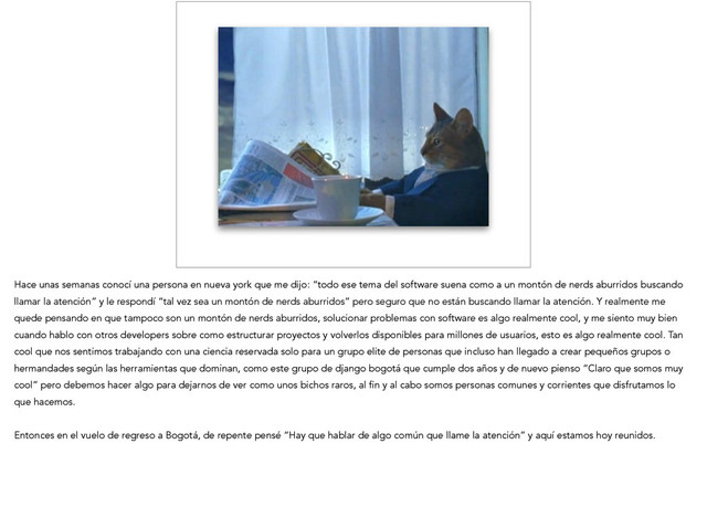 ! # We can crawl for urls too url = ['http://crepesywaffles.com.co',] ! with codecs.open('crawled.log', 'a', 'utf-8') as outfile: for url in url_list: print 'Getting page %s ...' % url res = requests.get(url) if not res.ok: break doc = pq(res.content) images = doc('img') if not images: break for image in images: url = image.attrib.get('src') name = image.attrib.get('alt') img_file = download_file(url) obj, created = Entry.objects.get_or_create(name=name, image=File(img_file)) if created: outfile.write(url + '\n') print 'Done.' crawler.py Vamos a imaginar nuestro ‘crawler’ que utiliza urls y consigue las imágenes que allí se muestran. ! “Hipoteticamente” luciría como lo vemos aquí, pyquery es una librería que se instala por pypi y la podemos incluir así en nuestro proyecto, luego vamos a definir una lista de urls que quisiéramos analizar, esa lista puede ser estatica o podemos hacer un crawler para obtener las urls de forma automatica también, por lo pronto lo definimos manualmente a el home de la página de crepes y waffles. ! Luego vamos a abrir un archivo de log para llevar un registro del análisis que vamos a realizar, luego por cada url de nuestro listado de urls vamos a comenzar a obtener información. ! Utilizando la librería requests, también disponible desde pypi vamos a consultar la url con el método get, si la consulta no fue exitosa vamos a salirnos del ciclo, de lo contrario vamos a enviar el resultado de la consulta, básicamente el contenido html a pyquery el cual nos crea un objeto, llamado doc, al cual podemos hacer consultas con selectores como los utilizados en jquery para obtener elementos html que podemos utilizar en python, en este caso estamos utilizando el selector general ‘img’ para que nos traiga todos los elementos html creados con el tag ‘img’ eso lo estamos almacenando en la variable images, si no hay imágenes nos salimos del ciclo, pero si hay vamos a ir por cada una de ellas y vamos a obtener los atributos del origen de la imagen y el nombre, con esa información vamos a llamar a nuestro metodo download_file al cual enviamos la url, y en un momento veremos en detalle, el