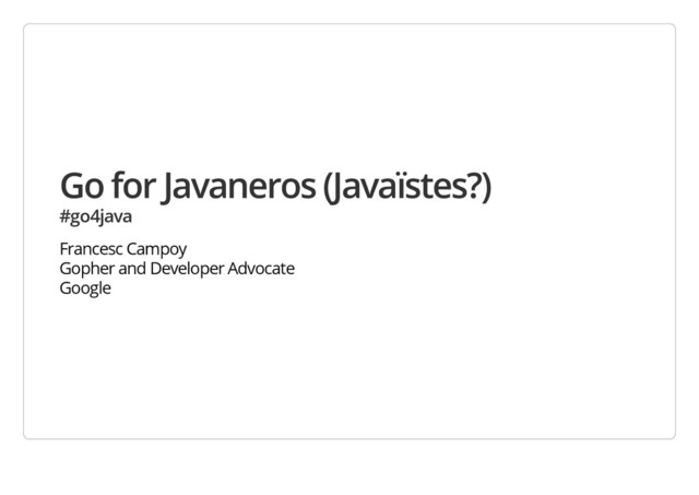 tour.golang.org (http://tour.golang.org) Find more about Go on golang.org (http://golang.org) Join the community at golang-nuts (https://groups.google.com/forum/#!forum/Golang-nuts) Link to the slides talks.golang.org/2014/go4java.slide (http://talks.golang.org/2014/go4java.slide)
