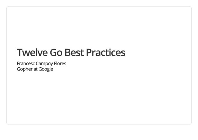 2. Avoid repetition when possible 3. Important code goes first 4. Document your code 5. Shorter is better 6. Packages with multiple files 7. Make your packages "go get"-able 8. Ask for what you need 9. Keep independent packages independent 10. Avoid concurrency in your API 11. Use goroutines to manage state 12. Avoid goroutine leaks