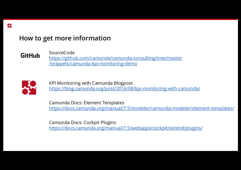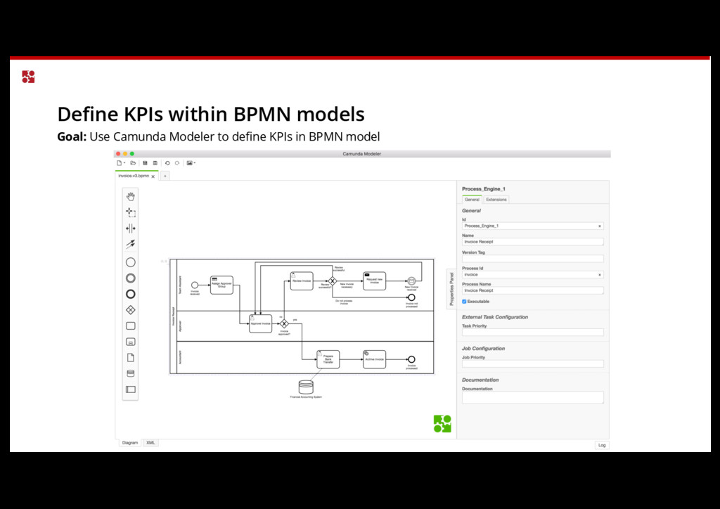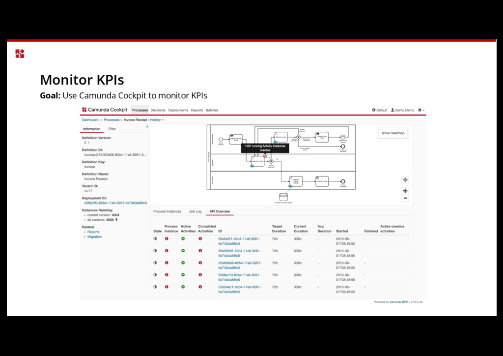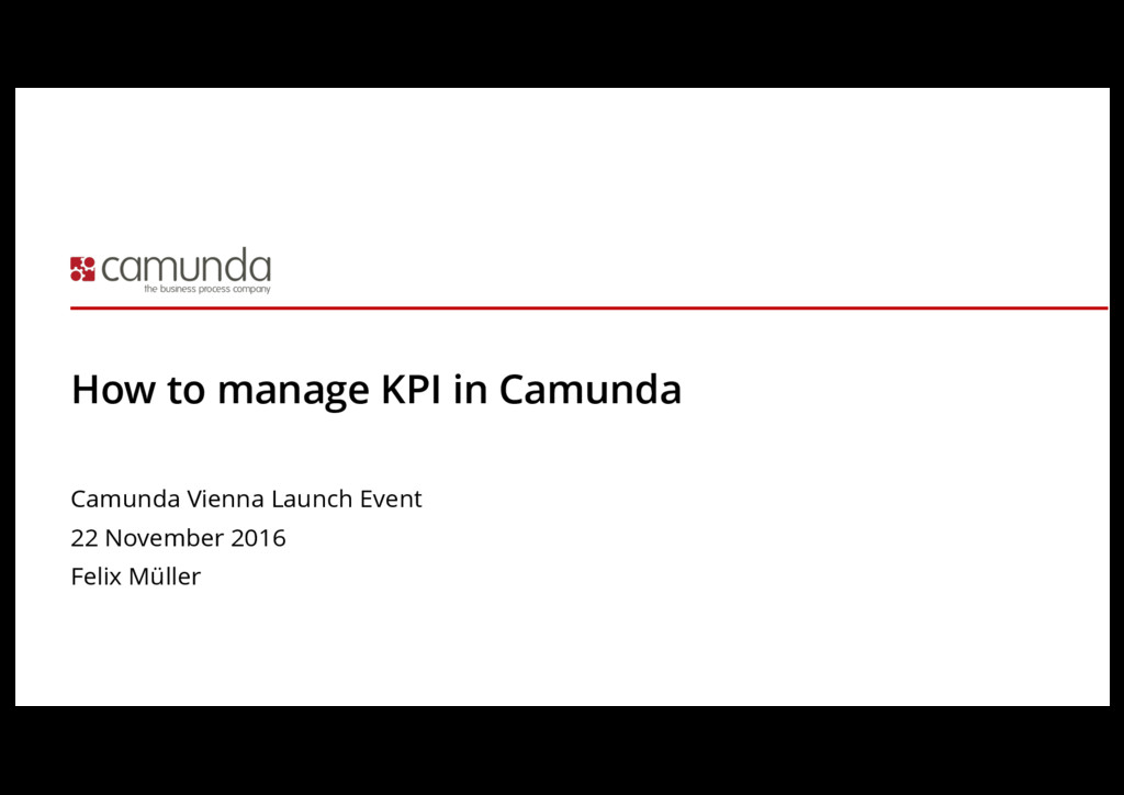 Felix Müller, Technical Consultant with Camunda Services GmbH in Berlin, shows us how to manage KPI (Key Performance Indicators) in Camunda: One of the big advantages of Camunda BPM is the open architecture, which allows you to implement almost any requirement you might have. Felix will show us how to leverage Camunda's extensible API to build a KPI Monitoring Extension End-To-End.