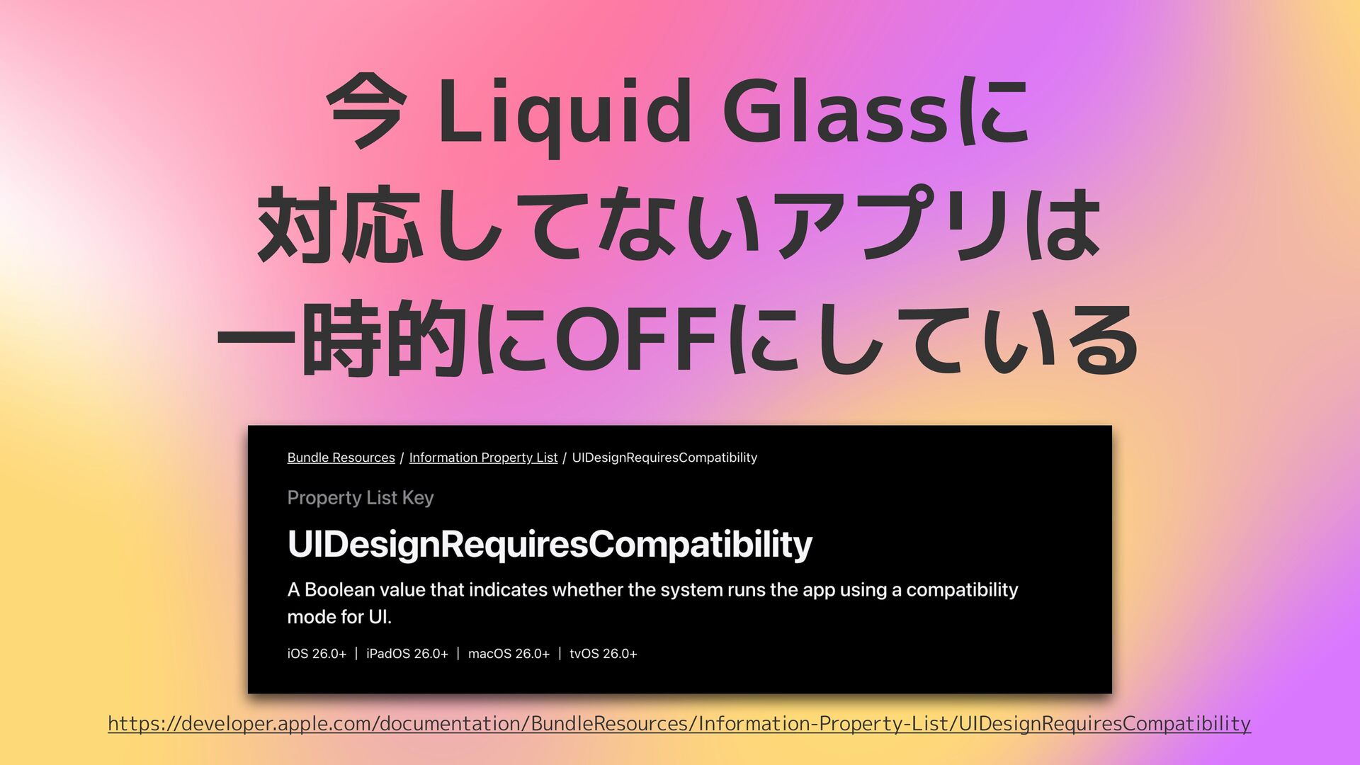今 Liquid Glassに 対応してないアプリは 一時的にOFFにしている https://developer.apple.com/documentation/BundleResources/Information-Property-List/UIDesignRequiresCompatibility