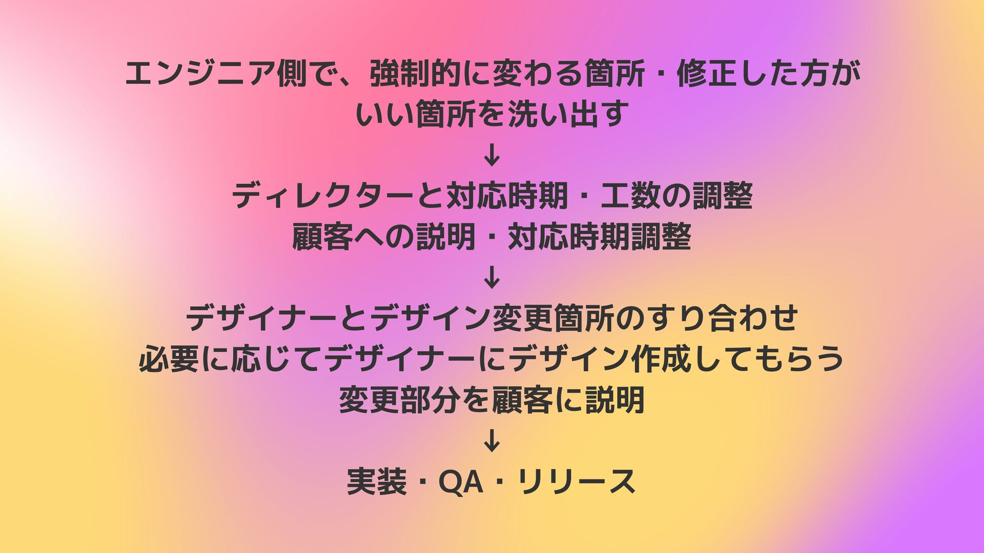 エンジニア側で、強制的に変わる箇所・修正した方が いい箇所を洗い出す ↓ ディレクターと対応時期・工数の調整 顧客への説明・対応時期調整 ↓ デザイナーとデザイン変更箇所のすり合わせ 必要に応じてデザイナーにデザイン作成してもらう 変更部分を顧客に説明 ↓