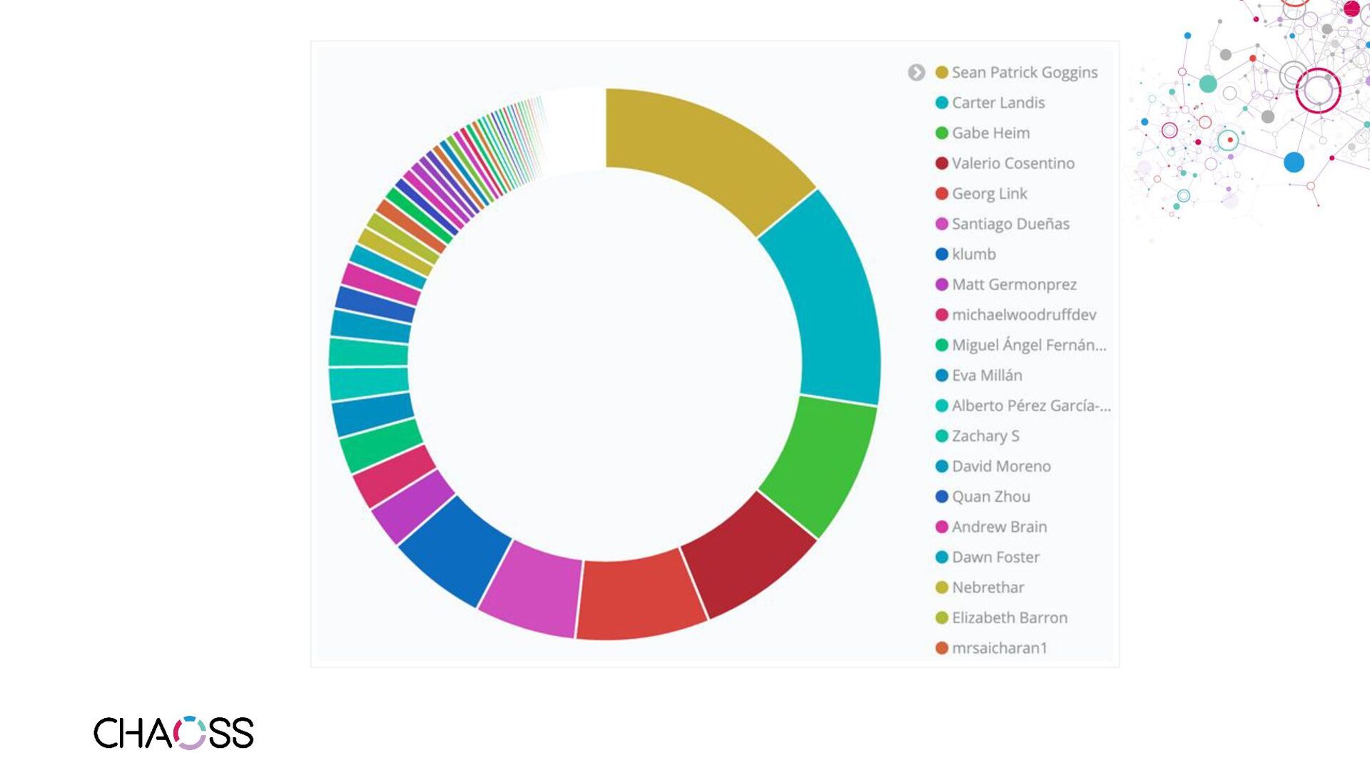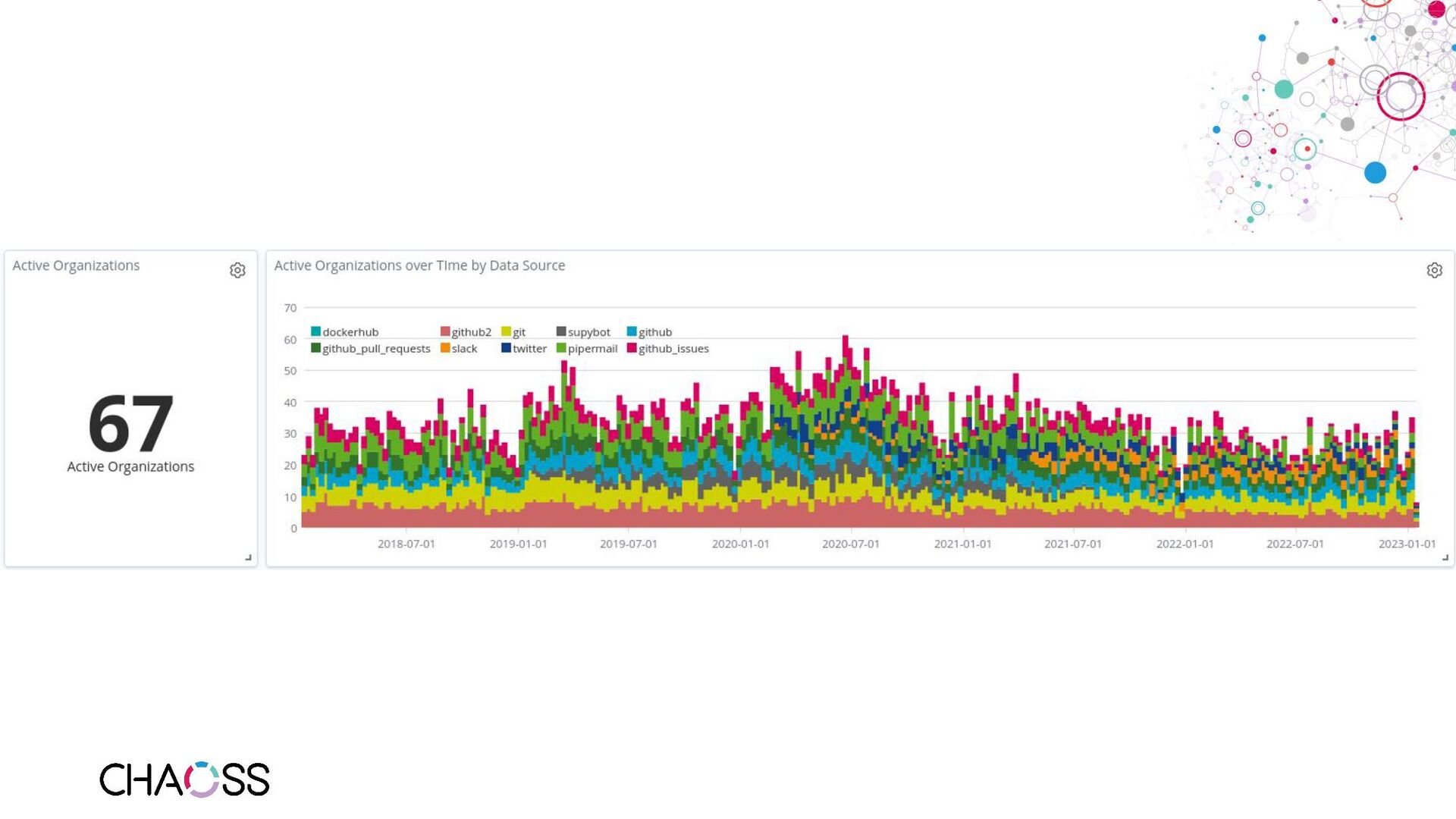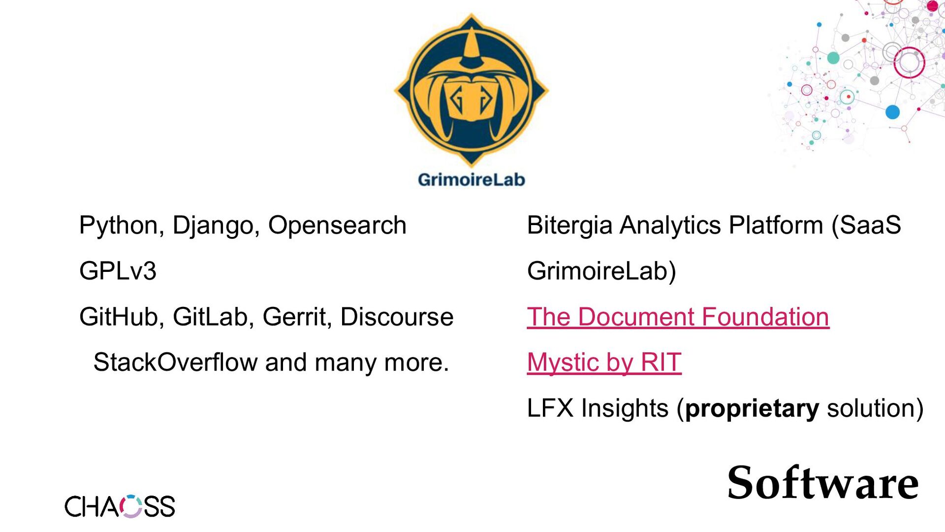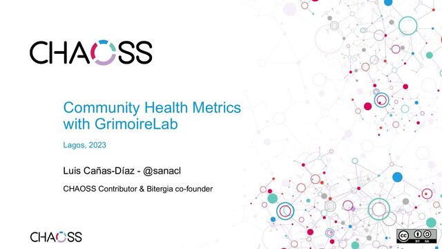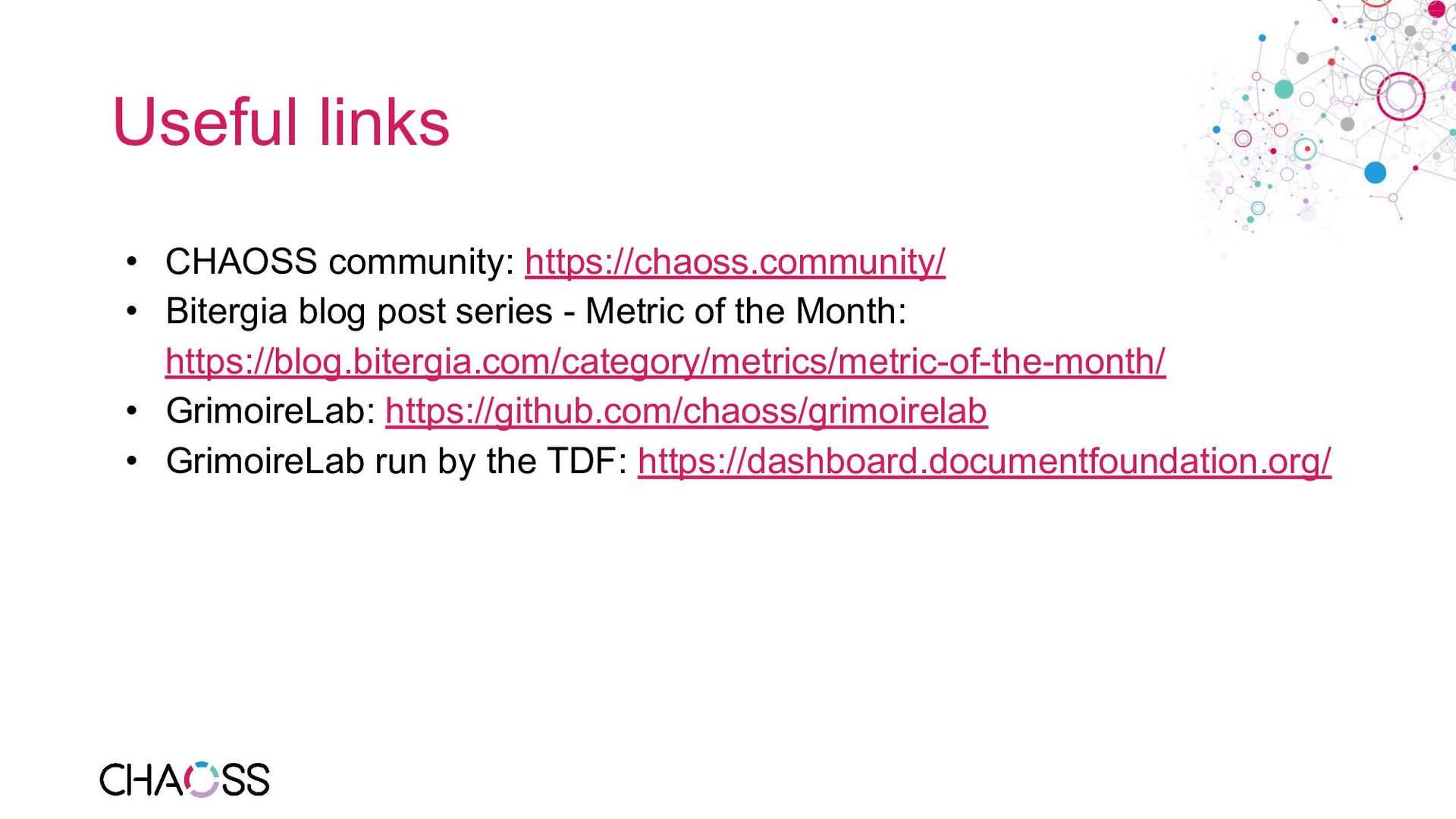 series - Metric of the Month: https://blog.bitergia.com/category/metrics/metric-of-the-month/ • GrimoireLab: https://github.com/chaoss/grimoirelab • GrimoireLab run by the TDF: https://dashboard.documentfoundation.org/