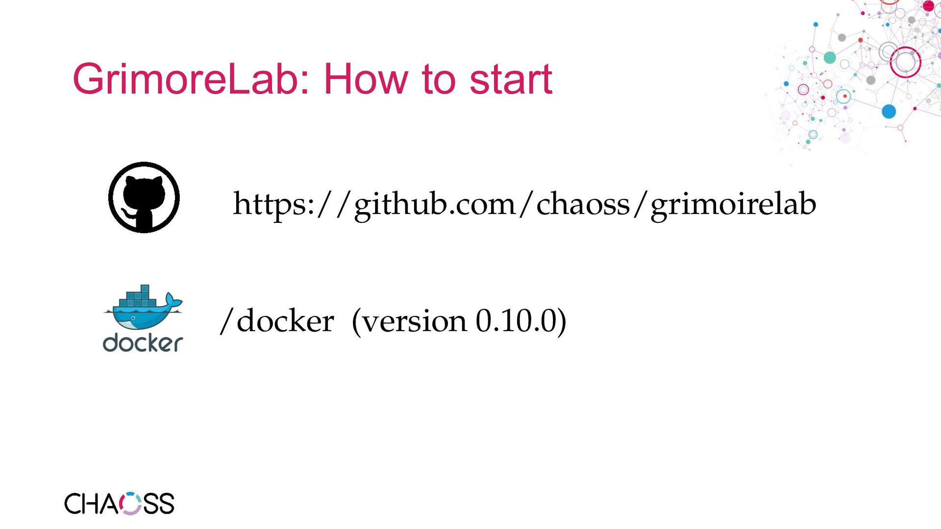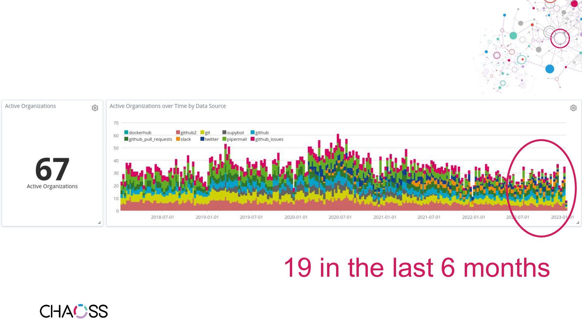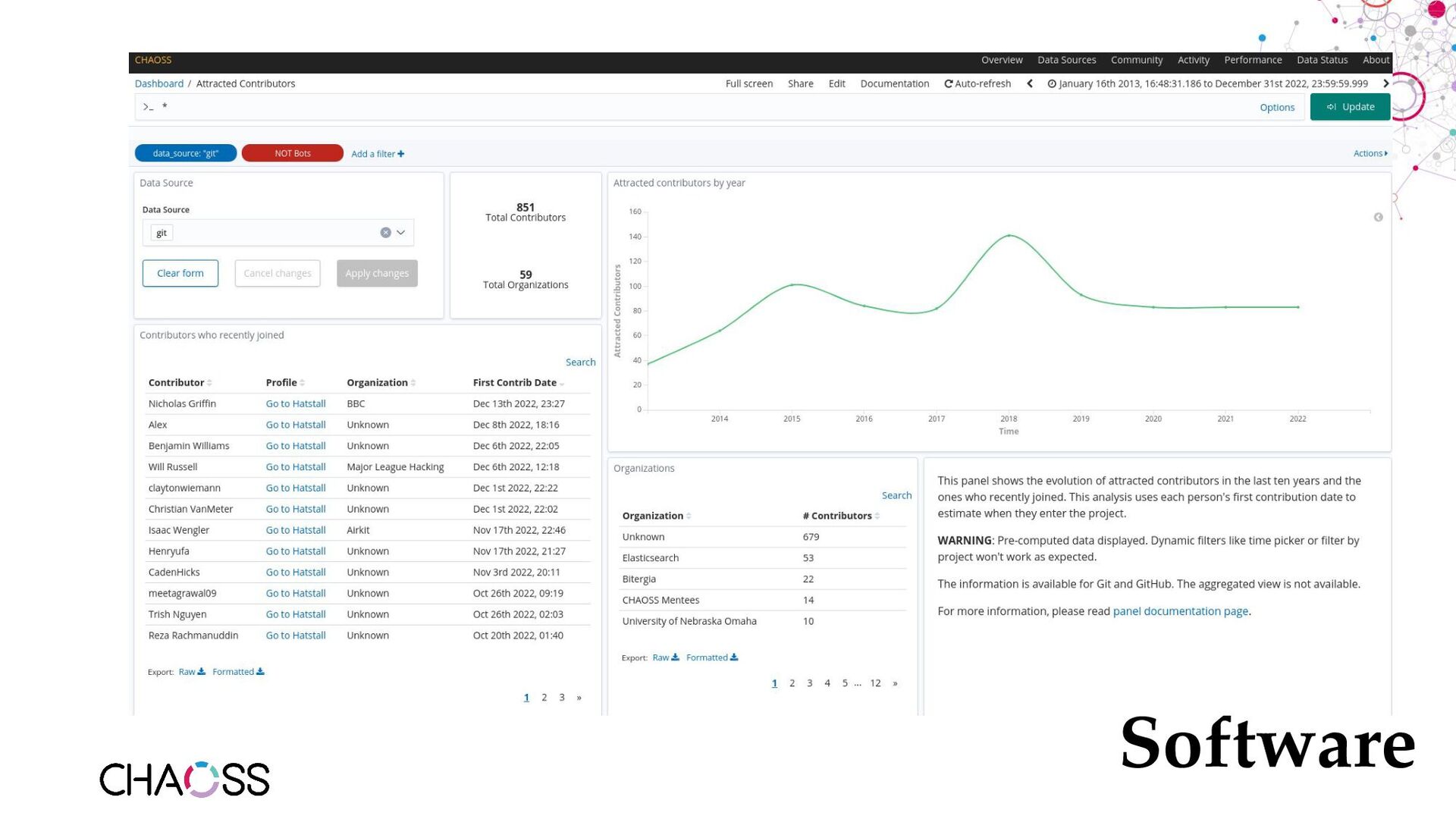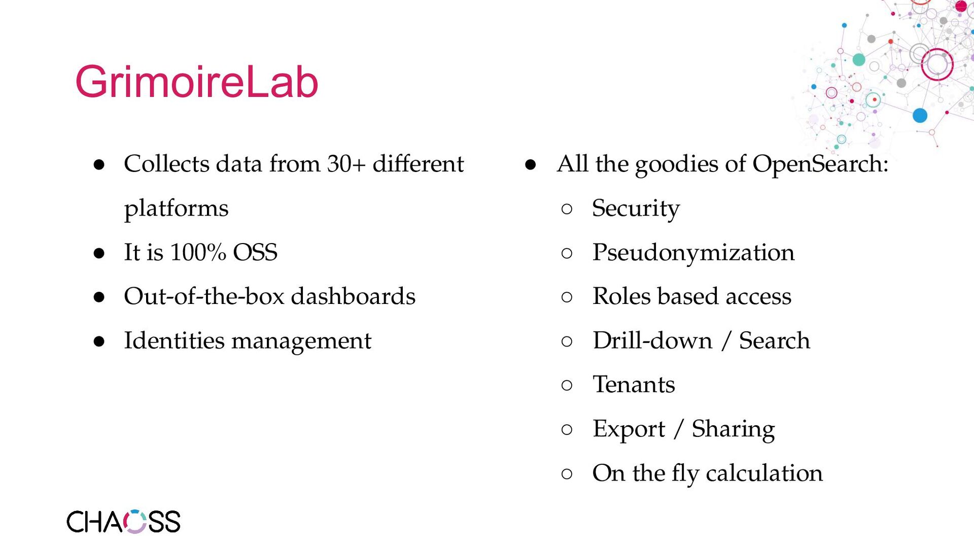 series - Metric of the Month: https://blog.bitergia.com/category/metrics/metric-of-the-month/ • GrimoireLab: https://github.com/chaoss/grimoirelab • GrimoireLab run by the TDF: https://dashboard.documentfoundation.org/