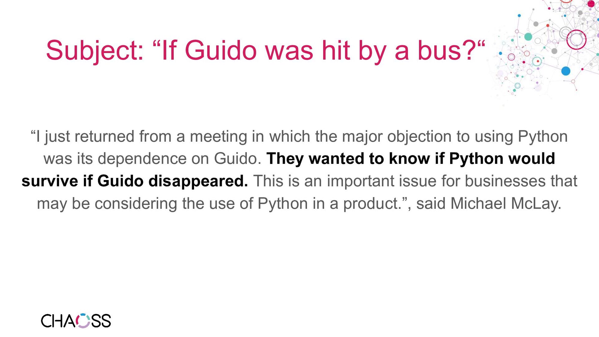 returned from a meeting in which the major objection to using Python was its dependence on Guido. They wanted to know if Python would survive if Guido disappeared. This is an important issue for businesses that may be considering the use of Python in a product.”, said Michael McLay.