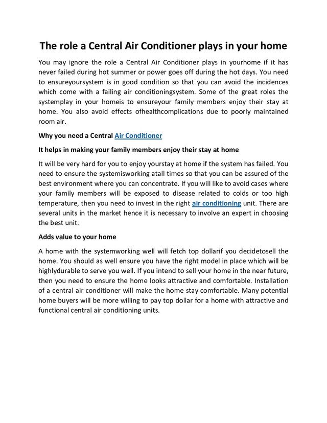 You may ignore the role a Central Air Conditioner plays in yourhome if it has never failed during hot summer or power goes off during the hot days. You need to ensureyoursystem is in good condition so that you can avoid the incidences which come with a failing air conditioningsystem. Some of the great roles the systemplay in your homeis to ensureyour family members enjoy their stay at home. You also avoid effects ofhealthcomplications due to poorly maintained room air. Why you need a Central Air Conditioner It helps in making your family members enjoy their stay at home It will be very hard for you to enjoy yourstay at home if the system has failed. You need to ensure the systemisworking atall times so that you can be assured of the best environment where you can concentrate. If you will like to avoid cases where your family members will be exposed to disease related to colds or too high temperature, then you need to invest in the right air conditioning unit. There are several units in the market hence it is necessary to involve an expert in choosing the best unit. Adds value to your home A home with the systemworking well will fetch top dollarif you decidetosell the home. You should as well ensure you have the right model in place which will be highlydurable to serve you well. If you intend to sell your home in the near future, then you need to ensure the home looks attractive and comfortable. Installation of a central air conditioner will make the home stay comfortable. Many potential home buyers will be more willing to pay top dollar for a home with attractive and functional central air conditioning units.
