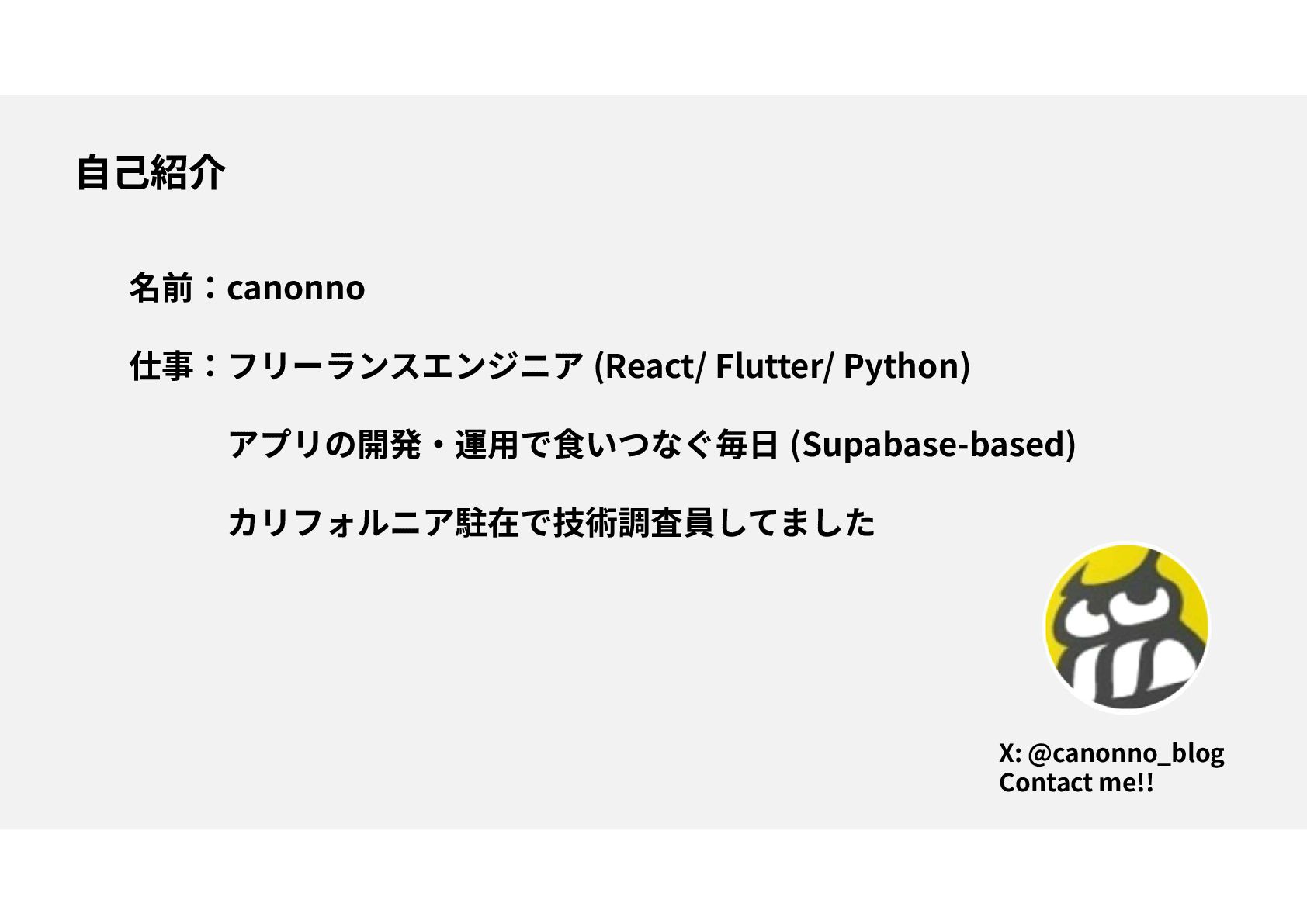 名前:canonno 仕事:フリーランスエンジニア (React/ Flutter/ Python) アプリの開発・運用で食いつなぐ毎日 (Supabase-based) カリフォルニア駐在で技術調査員してました X: @canonno_blog