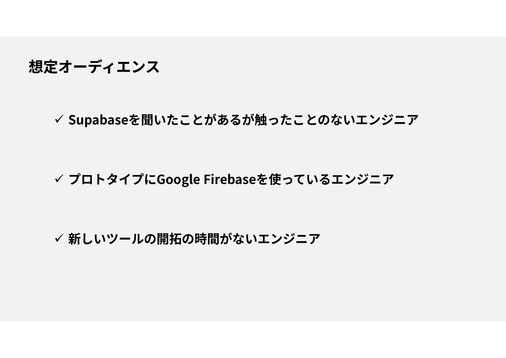 Supabaseを聞いたことがあるが触ったことのないエンジニア プロトタイプにGoogle Firebaseを使っているエンジニア 新しいツールの開拓の時間がないエンジニア