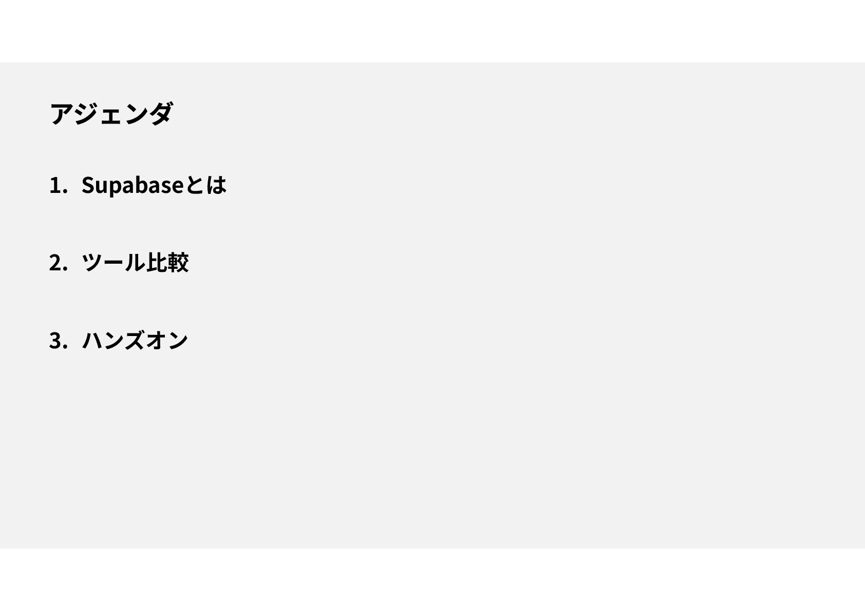 1. Supabaseとは 2. ツール比較 3. ハンズオン
