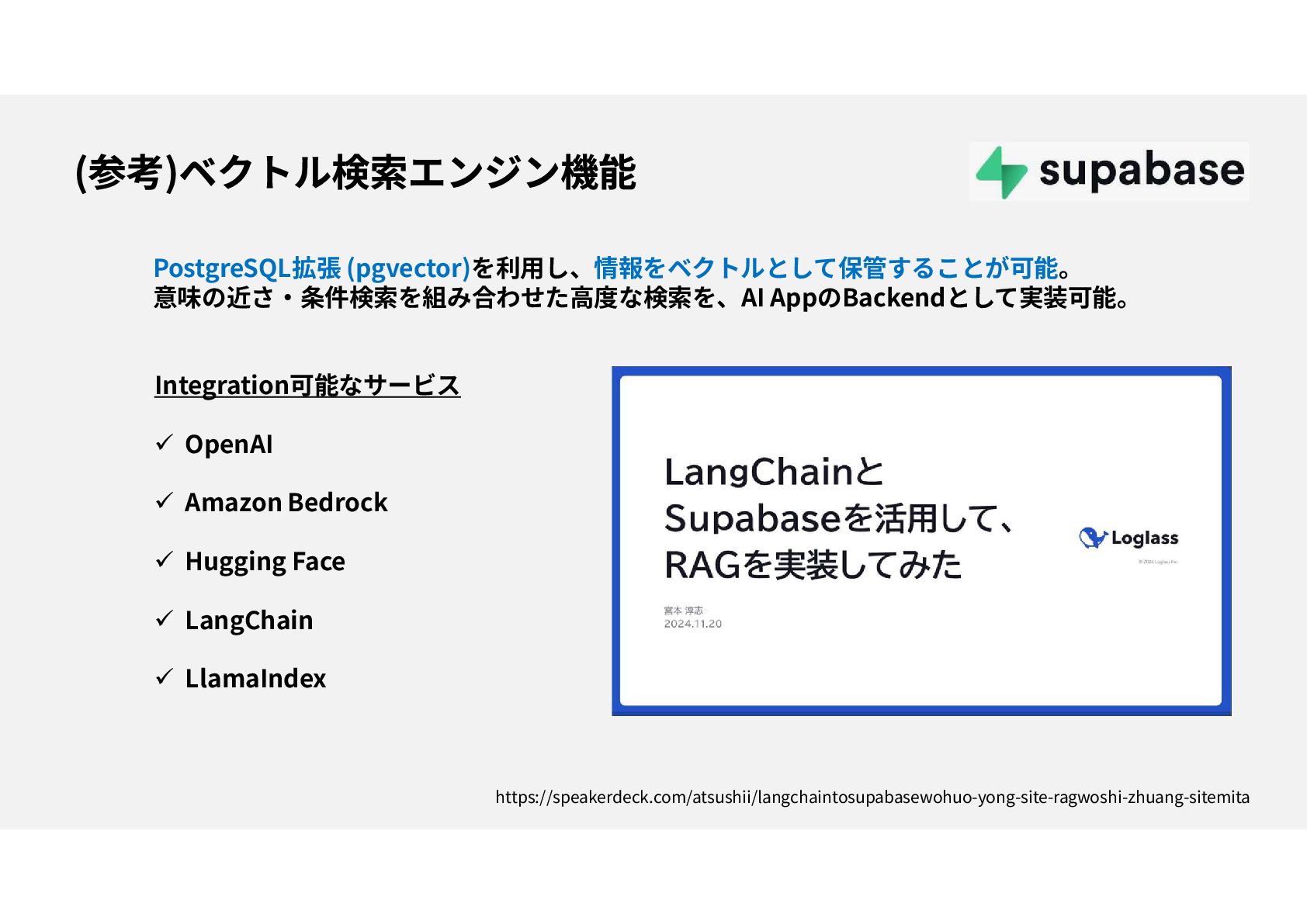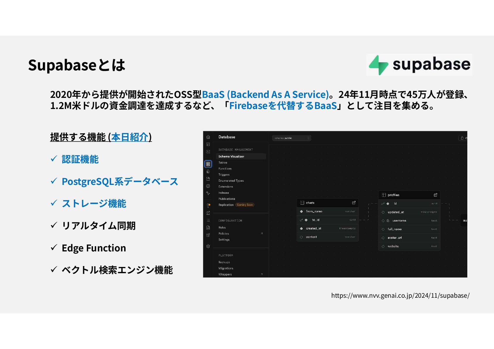 PostgreSQL系データベース ストレージ機能 リアルタイム同期 Edge Function ベクトル検索エンジン機能 https://www.nvv.genai.co.jp/2024/11/supabase/