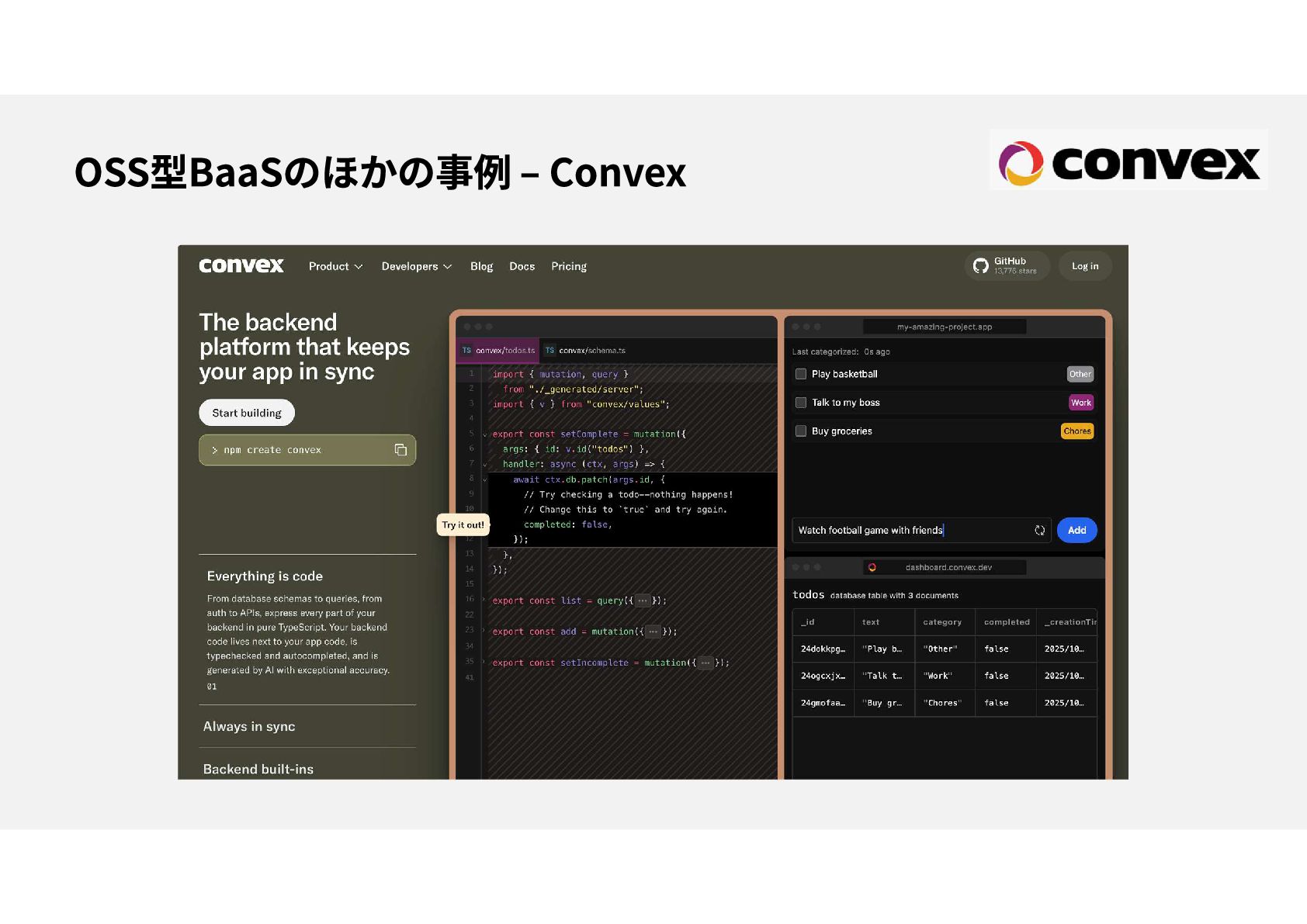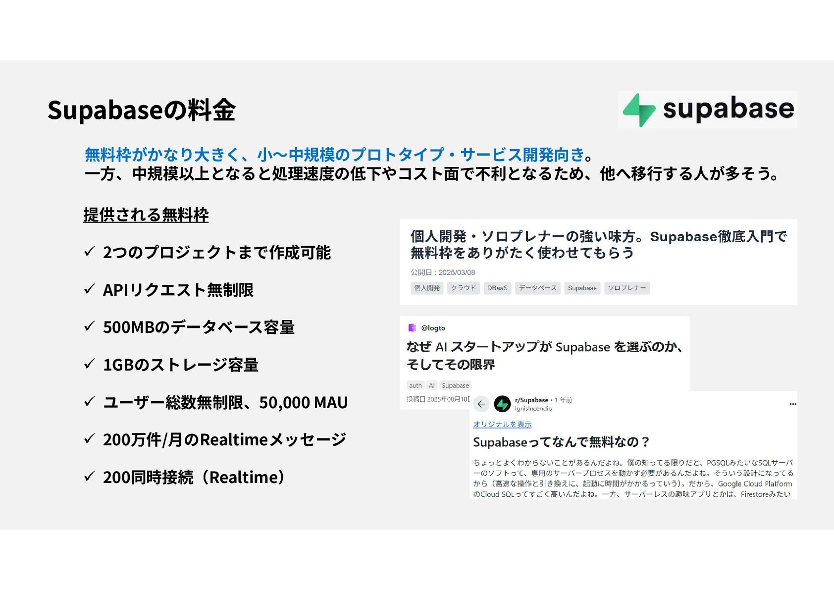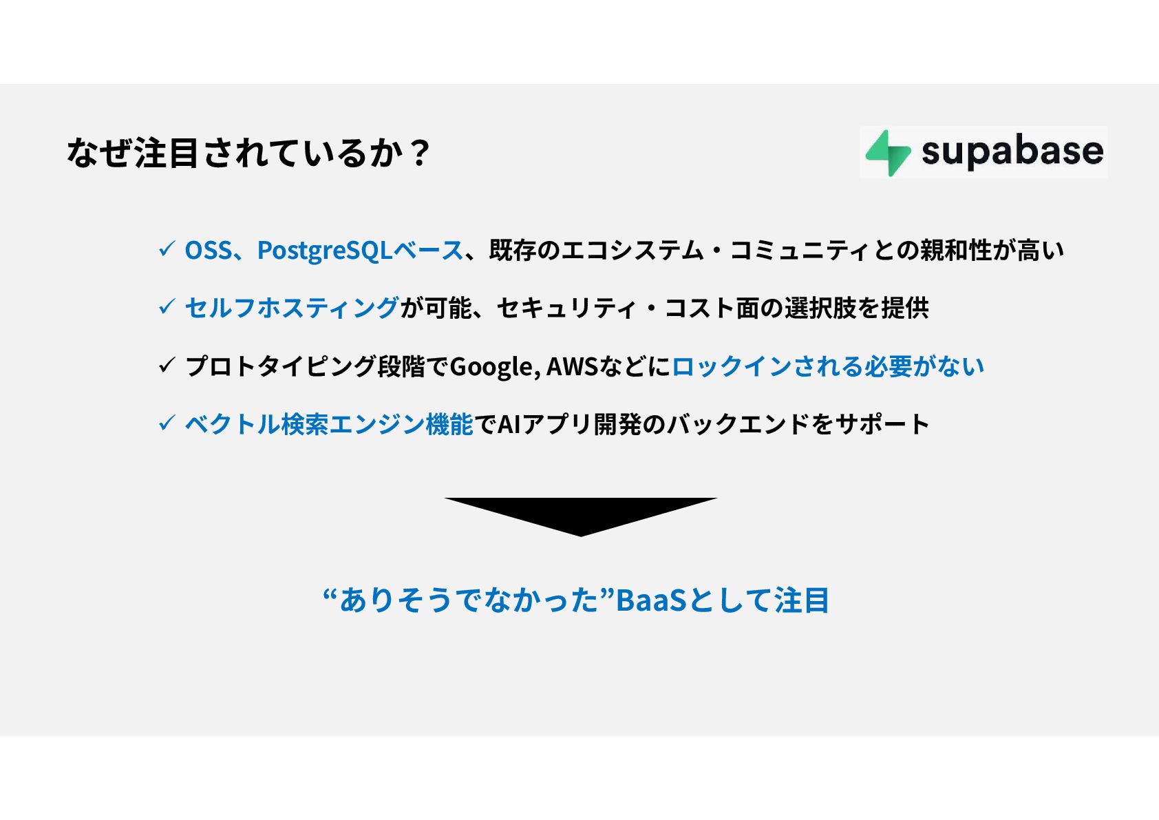 OSS、PostgreSQLベース、既存のエコシステム・コミュニティとの親和性が高い セルフホスティングが可能、セキュリティ・コスト面の選択肢を提供 プロトタイピング段階でGoogle, AWSなどにロックインされる必要がない ベクトル検索エンジン機能でAIアプリ開発のバックエンドをサポート “ありそうでなかった”BaaSとして注目