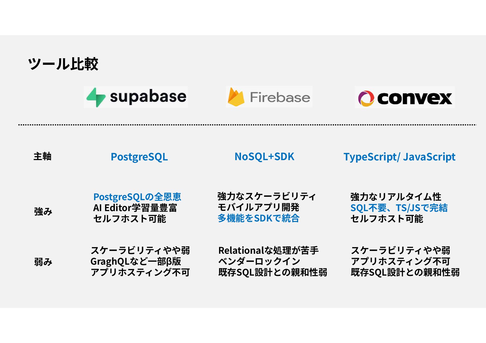 主軸 PostgreSQL TypeScript/ JavaScript 強み 強力なスケーラビリティ モバイルアプリ開発 多機能をSDKで統合 弱み NoSQL+SDK