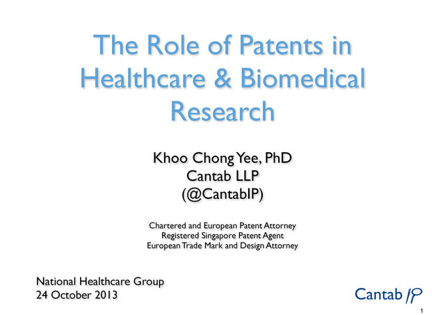 Chong Yee, PhD Cantab LLP (@CantabIP) Chartered and European Patent Attorney Registered Singapore Patent Agent European Trade Mark and Design Attorney National Healthcare Group 24 October 2013 1