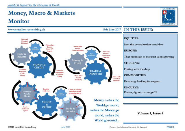 the end of this document PAGE 1 13th June 2017 www.cantillon-consulting.ch Insight & Support for the Managers of Wealth Money, Macro & Markets Monitor Money makes the World go round, makes the Money go round, makes the World go round... IN THIS ISSUE:- EQUITIES: Spot the overvaluation candidate EUROPE: That mountain of mistrust keeps growing STERLING: Flirting with the drop COMMODITIES: Ex-energy looking for support US CURVE: Flatter, tighter ...stronger?? Volume I, Issue 4