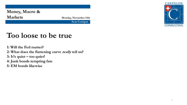 Markets Monitor Insight & Support for the Managers of Wealth Disclaimer All content is intended to give general advice only. The investments and instruments mentioned therein are not necessarily suitable for every individual and you should use this information in conjunction with other advice and research to determine its suitability for your own circumstances and risk preferences. The value of all securities and investments, as well as the income derived from them, can fall as well as rise. Your investments may be subject to sudden, often substantial, declines in value which may not be recoverable; others may expire worthless after a specified period. You should not buy any of the securities or other investments mentioned with money you cannot afford to lose. In some cases there may be significant charges which may reduce the value of your investment. You run an extra risk of losing money when you buy shares in certain securities where there is a large difference or ‘spread’ between the buying price and the selling price, a circumstance which means that, should you sell them immediately, you may get back much less than you paid for them. In the case of investment trusts and certain other funds, these may use or propose to use the borrowing of money in order to increase the size of their exposures and/or invest in other securities with a similar strategy. As a result, movements in the price of the securities may be more volatile than the movements in the prices of those underlying investments. Some investments may involve a high degree of such borrowing (often referred to as ‘gearing’ or ‘leverage’) This means that a small movement in the price of the underlying asset may have a disproportionately large effect on that of your investment. Accordingly, a relatively small adverse movement in the price of the underlying asset can result in the loss of the entirety of your original investment. Changes in rates of exchange may have an adverse effect on the value or price of the investment and you should be aware that additional dealing, transaction, and custody charges for certain instruments may result when these are not traded in your home currency. Some investments may not be quoted on a recognised investment exchange and, as a result, you may find them to be ‘illiquid’. You may not easily be able to trade your illiquid investments and, in certain circumstances, it may become difficult, if not impossible to sell the investment in a timely manner and/or at its indicative price. Investment in any of the assets mentioned may have tax consequences regarding which you should consult your tax adviser. All reasonable care has been taken to ensure that all statements of fact and opinion contained in the either written or spoken form are fair and accurate in all material respects. All data is from sources considered to be reliable but its accuracy cannot be guaranteed. Investors should seek appropriate professional advice if any points are unclear. Copyright ©2017 Cantillon Consulting Sàrl. Any disclosure, copy, reproduction by any means, distribution, or other action which relies on the contents of such materials, made without the prior written consent of Cantillon Consulting, is strictly prohibited and could lead to legal action. November 13th, 2017