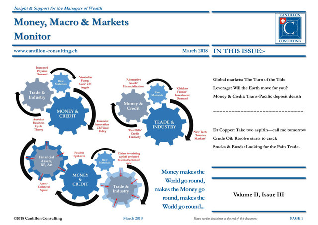 disclaimer at the end of this document PAGE 2 Money, Macro & Markets Monitor Insight & Support for the Managers of Wealth www.cantillon-consulting.ch Sixteen months on from the political earthquake which unleashed the extraordinary Trump Bump of smartly rising asset prices and strengthening macro-economic numbers, we have lately begun to ask ourselves whether we are about to witness the appearance instead of its mirror-image – of a period of at least partial reversal which we might come to christen the Trump Dump. Since overturning the psephologists’ calculations, along with much of what passed for conventional wisdom, Mr Abrasive – for all his seeming caprice and in spite of his inex- haustible penchant for playground point-scoring – does seem to have invigorated many of the Forgotten Men and Women outside of America’s pampered littoral elites. Though far from unblemished in its record of attainment, his regime has also delivered some wel- come respite from the regulatory kudzu which was undeniably strangling the country’s native crop of own-two-feet self-reliance. On top of that, we have seen what is, thus far, the crowning glory of his term in office – the tax package – entered into the statue books, all to the utter chagrin of Mr. T’s many detractors. He has even largely managed to avoid too debilitating an addiction to the sort of head- first, drones-away foreign policy adventurism which has been the bane of so many of his predecessors in the Oval Office – if only by means of what seems to have been a wilful, almost programmatic disruption of the career ambitions of the various sinister apparat- chiks and would-be Strangeloves who inhabit the dingy recesses of the Departments of State and Defense, as well as of the Edge-of-the-Map monstrosities who swim amid the toxic alphabet soup of the national security hierarchy. We, at the height, are ready to decline Of late, however, the question keeps thrusting itself unbidden into our mind about whether our presidential fireball has already reached its zenith, its flaming course through the political heavens about to turn decisively lower at last. The first source of concern is that, after the undoubted boon of lighter regulation and lowered taxes (a blessing only sullied by the accompanying loss of what little sense of fis- cal restraint there might have existed in Washington), we now seem to be locked into the destructive issue of tariffs, quotas, and crass bilateralism on the trade front – in other words, to be embarking on a course which will add to both the difficulty and the cost of doing business in place of reducing them both. The one, faint flicker of hope here is that Trump is after what he often seems to do best: namely, to bully those he paints as his antagonists into doing something half-way sensible, despite themselves. For example, the seemingly pointless irritation of steel and aluminium duties has already served to highlight the various restrictive practices – as well as the obvi- ous cant - of both the Europeans and the Chinese, when it comes to matters of trade. If the Donald is merely manoeuvring therefore to achieve some sort of mutual decrease in impediments to commerce, rather than ostensibly seeking to raise them, our forebodings might yet be unrealised. It is, however, far too flimsy a chain of supposition to be relied upon at this stage of the game, meaning that we must first treat the loud Protectionist quacking as the call of a full- fledged Protectionist duck. Our legions are brim-full, our cause is ripe Beyond that, the dark spectre of ‘geopolitics’ (aka: armchair generalship) seems to be stir- ring in its grave, with Trump’s latest, abrupt appointments to the relevant positions being men of a reflexively, if not an irrationally, hawkish mien when it comes to both Russia and Iran. Further hostile intent toward the first could risk a confrontation too terrible almost to contemplate, while an abrogation of the accord reached with the second would not only further inflame that cockpit of horrors which is the Middle East, but potentially destabilize energy markets and hence undermine the wider economic framework, into the bargain. Finally, there can surely only be downside risk in the shape of the coming US mid-term elections. One must suppose that even a Ballot-box Barnum like Trump cannot surprise us twice in the same manner and so will lose some good measure of command over the levers of government this autumn. This should be a matter of broad indifference to those of us who live outside the US of A, as well as a matter of some comfort to the valiant Constitutionalists who do; those virtuous souls who believe that the separation of powers is to be cherished even if it is their side’s imperial presidency which is this time frustrated A tide in the affairs of men