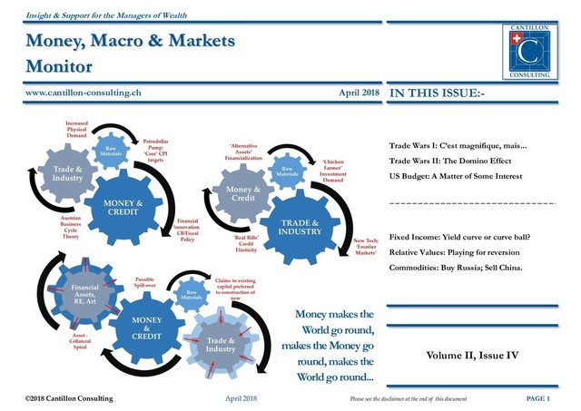 disclaimer at the end of this document PAGE 2 Money, Macro & Markets Monitor Insight & Support for the Managers of Wealth www.cantillon-consulting.ch In his much-anticipated opening address at the Boao Forum, Xi Jinping proclaimed his intent to continue his nation’s ‘opening up’ process by lowering hurdles to capital access for foreigners in the financial industry and especially in insurance, while lowering tariff barriers on the automotive industry in particular. Having seemingly adopted a much more accommodating line than perhaps had been sug- gested by the strident rhetoric dominating the official media, Xi’s words were audibly ac- companied by a mass release of breath in world financial markets, grown increasingly edgy in the wake of President Trump’s loud attack on China’s contentious trade practices. The optimists will seek to interpret Xi’s mollifying tone as a sign that the worst fears of a second Smoot-Hawley are now to be discounted, while the pessimists will be nervous that what seems like a swift triumph for the Art of the Deal will only encourage the ‘Bidness Man’ in the Oval Office to further acts of provocation. The cynics will instead roll their eyes at the warmed-over nature of Xi’s promises on auto- motive duties – this not being the first time that such intentions have been vouchsafed in recent years – while reminding themselves that the truly determined protectionist usually elevates all sorts of far more intractable and often ill-defined non-tariff barriers to limit his fellow citizens’ freedom of choice when the mood takes him. They will further note that the pending invitation to come help shore up China’s hyper- trophic and ramshackle financial superstructure is more of a poison chalice than a loving cup of international amity. The final strand of opinion, not necessarily wrong, but definitely needing Atlas-like quali- ties of fortitude to bear the crushing burden of proof entailed by their interpretation is the one which surmises Trump does not in any way intend to disrupt global commerce, just to highlight the hypocrisy and double-dealing of so many of the of the participants in the global charade of ‘managed trade’ and so shame them into a series of mutually enrich- ing concessions. Well, yes, but.... Mine! Yours! Off the offer bid! Pull my bid! Let us now return to the main front in this financial war of Blue-on-Blue. As so often happens when we Occidentals ingenues have to try to fathom out what the crafty, inscru- table Orientals (as we still subconsciously stereotype them) are up to, this whole trade spat has brought forth a new spate of instant China experts, few of whom can even lay claim to much logic, much less an inside track to the thinking of the heads of the CPC. China will (is) selling - or has stopped buying - Treasuries, we are all anxiously assured. But have they, will they, and if so, why?? Yes, stopped buying at the moment, perhaps, since there has been no meaningful addition to FX reserves so far this year even though there should have been an accumulation of anything up to $60 billion if the trade and usual FDI surplus is added to the effects of a weaker dollar on the total. But if not Treasuries then perforce something else and, whatever it is that China is buy- ing, the inexorable logic of current account arithmetic tells us that it must be still rather substantial. But, in any case, would China actively sell USTs? Hmmm, let me see. In order to preserve (or defiantly to extend) its trade surplus, people are proposing that it will act to tighten the domestic credit conditions facing its principal customer (by driving up interest rates there) while simultaneously weakening that customer’s currency, thus shifting the terms of trade – i.e., the relative prices of America’s imports and exports - against itself! This is sufficiently fundamental to bear restating. China – if it is to continue to export to, more than it imports from the US - cannot help but accumulate claims upon the latter or, failing that, to find someone else to swap these for a consideration in goods or other claims. The first of these alternatives naturally only makes the dollars involved someone else’s ‘problem’ – to recall the spirit of John Connally – and so alters little. The second ends up in the same place but does at least open the way for the Chinese to become a little more hurried in disposing of Uncle Sam’s currency to the point they adversely affect its value and hence act to their exporters’ detriment. Charge me more—or else!