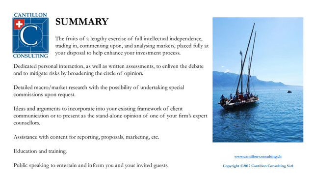 independence, trading in, commenting upon, and analysing markets, placed fully at your disposal to help enhance your investment process. Dedicated personal interaction, as well as written assessments, to enliven the debate and to mitigate risks by broadening the circle of opinion. Detailed macro/market research with the possibility of undertaking special commissions upon request. Ideas and arguments to incorporate into your existing framework of client communication or to present as the stand-alone opinion of one of your firm’s expert counsellors. Assistance with content for reporting, proposals, marketing, etc. Education and training. Public speaking to entertain and inform you and your invited guests. www.cantillon-consulting.ch Copyright ©2017 Cantillon Consulting Sàrl