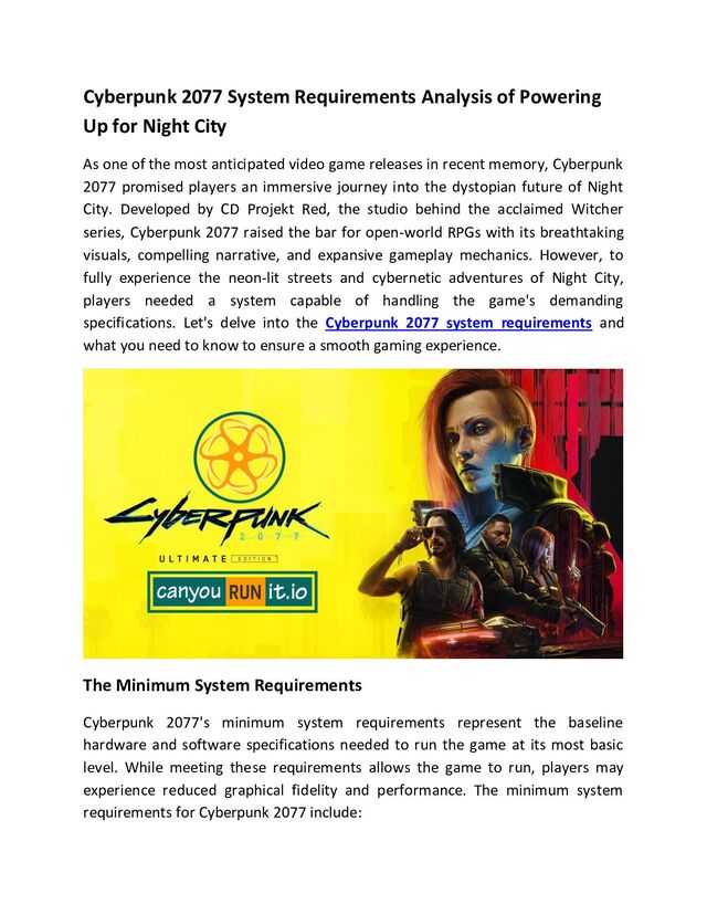 Cyberpunk 2077 is a 2020 action role-playing video game developed by CD Projekt Red and published by CD Projekt. For a seamless journey through the cybernetic metropolis, the minimum requirements include an operating system of at least Windows 7 or 10, powered by an Intel Core i5-3570K or AMD FX-8310 processor. You'll need a solid 8GB of RAM to keep up with the demanding cityscape and a graphics card like the NVIDIA GTX 780 3GB or AMD Radeon RX 470 to render the bustling streets and towering skyscrapers.