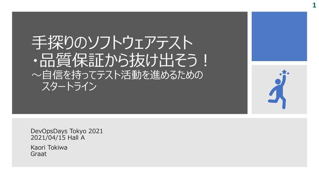 常盤香央里(ときわかおり) 北海道札幌市出身 グロース・アーキテクチャ&チームス 株式会社(Graat)所属 チームプロセス支援コンサルタント 前職にて組み込みソフトウェア開発 に14年かかわった経験も踏まえな がら、「改善活動ができるチームづく り」など、個人の力をチームの力にし ていくような支援を行っている @caori_t SaPIDファン♡ ゆるっとファシリテーター (ゆるぱし) WACATE実行委員 (ソフトウェアテストの合宿形式勉 強会) SigSQAメンバー (イマドキの品質保証を考える) Agile Testing Fellowship メン バー いつかAgileTestingDaysでワーク ショップ実施したい人