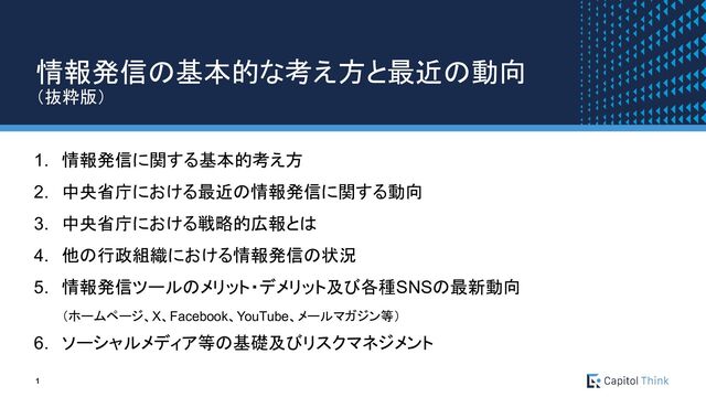 情報発信ツールのメリット・デメリット及び各種SNSの最新動向 (ホームページ、X、Facebook、YouTube、メールマガジン等) 6. ソーシャルメディア等の基礎及びリスクマネジメント 情報発信の基本的な考え方と最近の動向 (抜粋版)