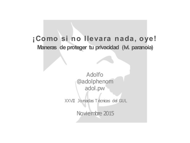 GUL ¿NO TIENES NADA QUE OCULTAR? PERFECTO. PERO NADIE TIENE POR QUÉ MIRAR • Siempre hay algo que se quiere mantener en secreto • Los gobiernos quieren tener a todos vigilados constantemente en internet • No digo de estar en contra 100%, sino de no pasarse de la raya • Las empresas compran/venden grandes BBDD de información con la que sacarle partido al uso de sus servicios con los usuarios • Constantes modificaciones de las leyes de vigilancias con vacíos legales para aprovechar el máximo poder posible • Etc. ¡Querer privacidad en internet, en tu ordenador, el móvil, etc., no es malo! 30 / 32