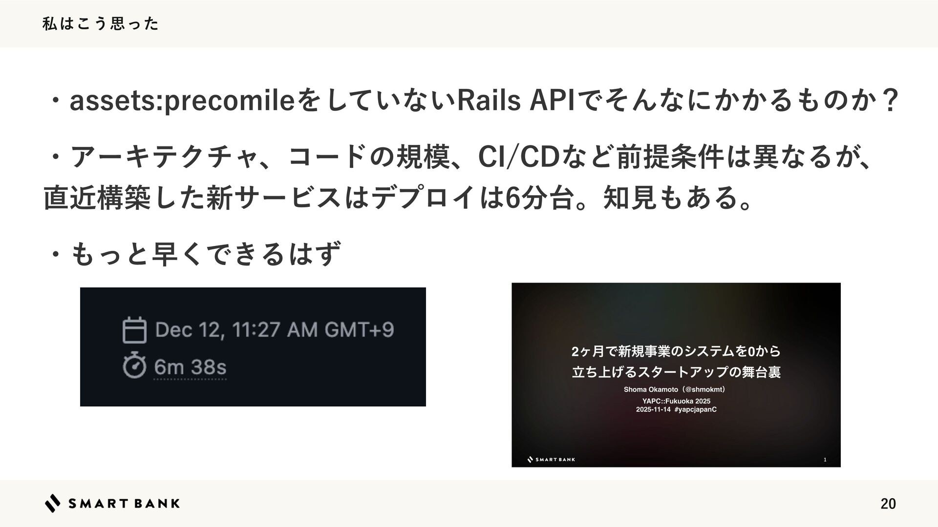 ࢲ͜͏ࢥͬͨ ɾBTTFUTQSFDPNJMFΛ͍ͯ͠ͳ͍3BJMT"1*ͰͦΜͳʹ͔͔Δͷ͔ʁ ɾΞʔΩςΫνϟɺίʔυͷنɺ$*$%ͳͲલఏ݅ҟͳΔ͕ɺ ۙߏஙͨ͠৽αʔϏεσϓϩΠɻݟ͋Δɻ ɾͬͱૣ͘Ͱ͖Δͣ