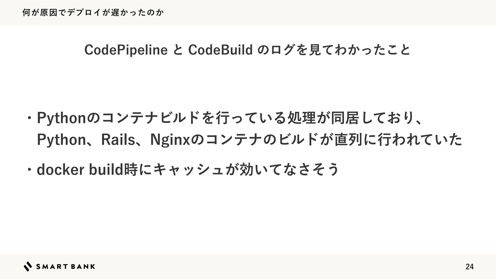 Կ͕ݪҼͰσϓϩΠ͕͔ͬͨͷ͔ ɾ1ZUIPOͷίϯςφϏϧυΛߦ͍ͬͯΔॲཧ͕ಉډ͓ͯ͠Γɺ ɹ1ZUIPOɺ3BJMTɺ/HJOYͷίϯςφͷϏϧυ͕ྻʹߦΘΕ͍ͯͨ ɾEPDLFSCVJME࣌ʹΩϟογϡ͕ޮ͍ͯͳͦ͞͏ $PEF1JQFMJOFͱ$PEF#VJMEͷϩάΛݟͯΘ͔ͬͨ͜ͱ