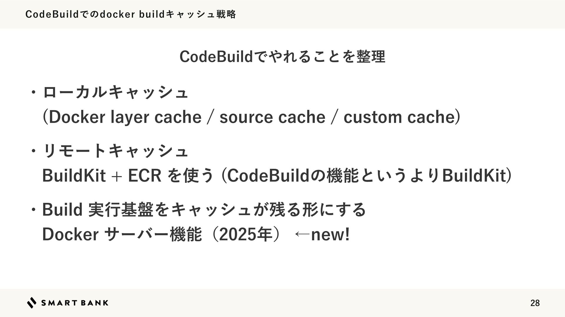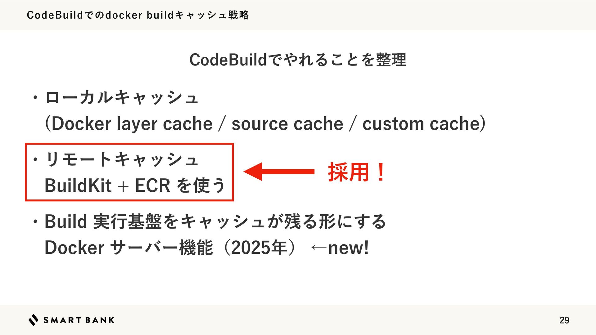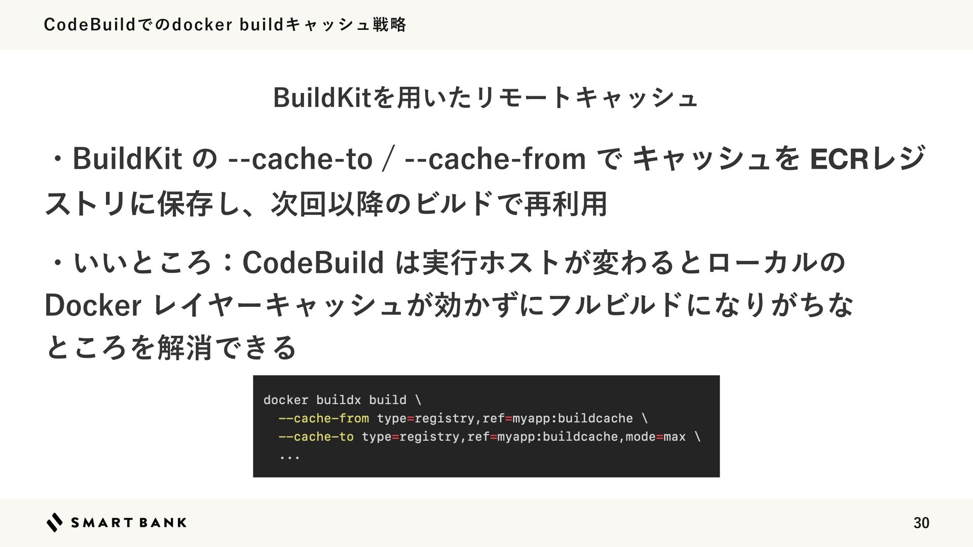 $PEF#VJMEͰͷEPDLFSCVJMEΩϟογϡઓུ ɾ#VJME,JUͷDBDIFUPDBDIFGSPNͰΩϟογϡΛ ECRϨδ ετϦʹอଘ͠ɺ࣍ճҎ߱ͷϏϧυͰ࠶ར༻ ɾ͍͍ͱ͜Ζɿ$PEF#VJME࣮ߦϗετ͕มΘΔͱϩʔΧϧͷ %PDLFSϨΠϠʔΩϟογϡ͕ޮ͔ͣʹϑϧϏϧυʹͳΓ͕ͪͳ ͱ͜ΖΛղফͰ͖Δ #VJME,JUΛ༻͍ͨϦϞʔτΩϟογϡ