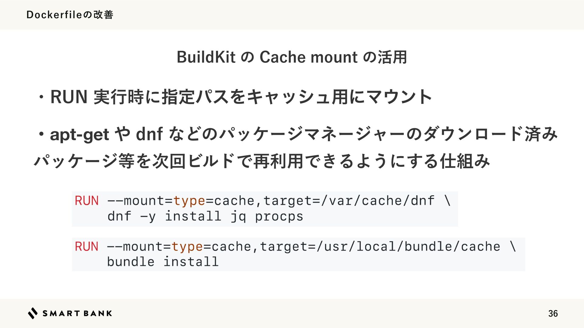 %PDLFSGJMFͷվળ ɾ36/࣮ߦ࣌ʹࢦఆύεΛΩϟογϡ༻ʹϚϯτ ɾapt-get EOGͳͲͷύοέʔδϚωʔδϟʔͷμϯϩʔυࡁΈ ύοέʔδΛ࣍ճϏϧυͰ࠶ར༻Ͱ͖ΔΑ͏ʹ͢ΔΈ #VJME,JUͷ$BDIFNPVOUͷ׆༻