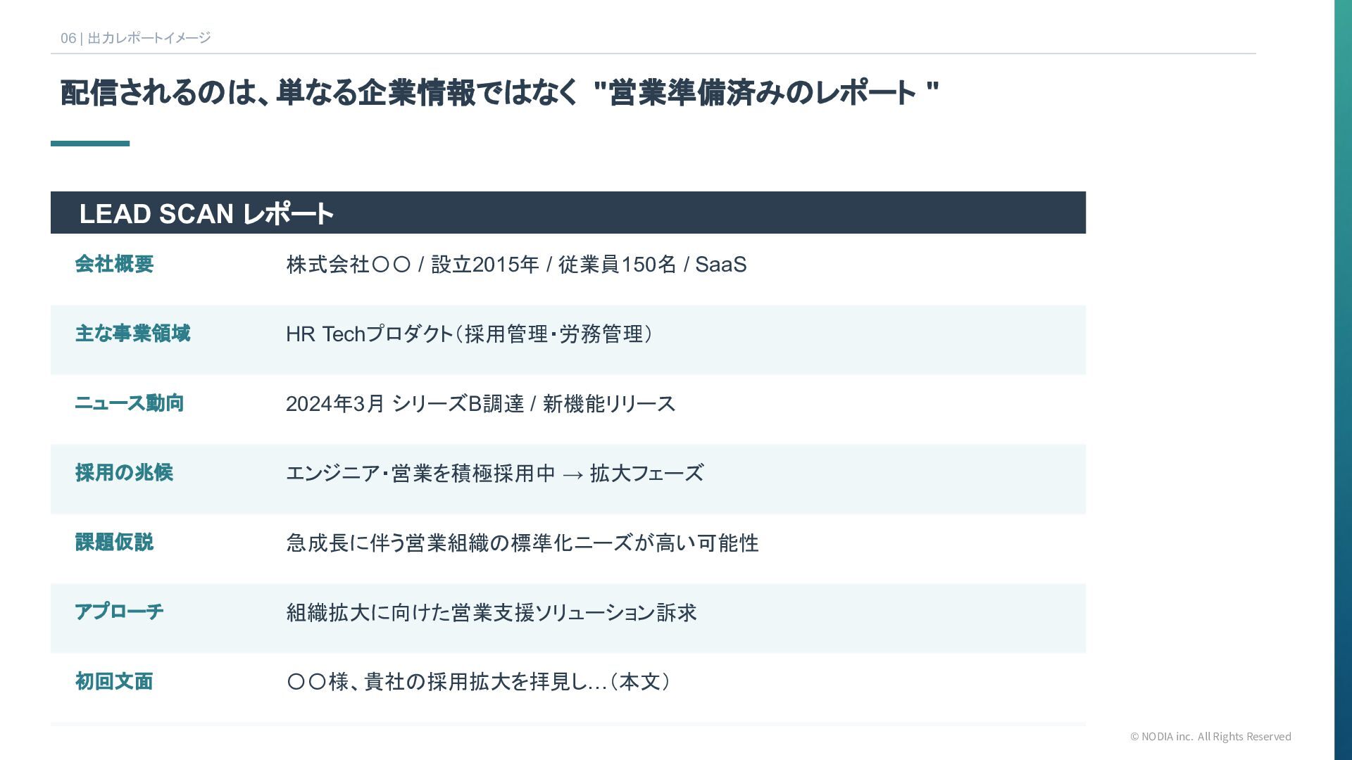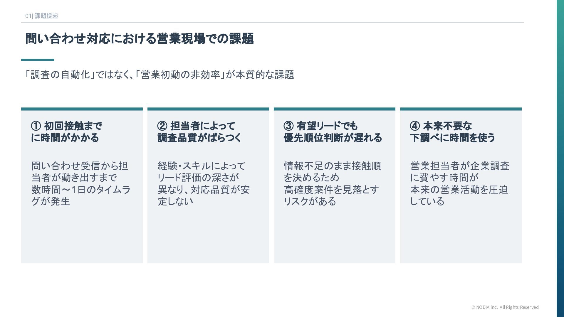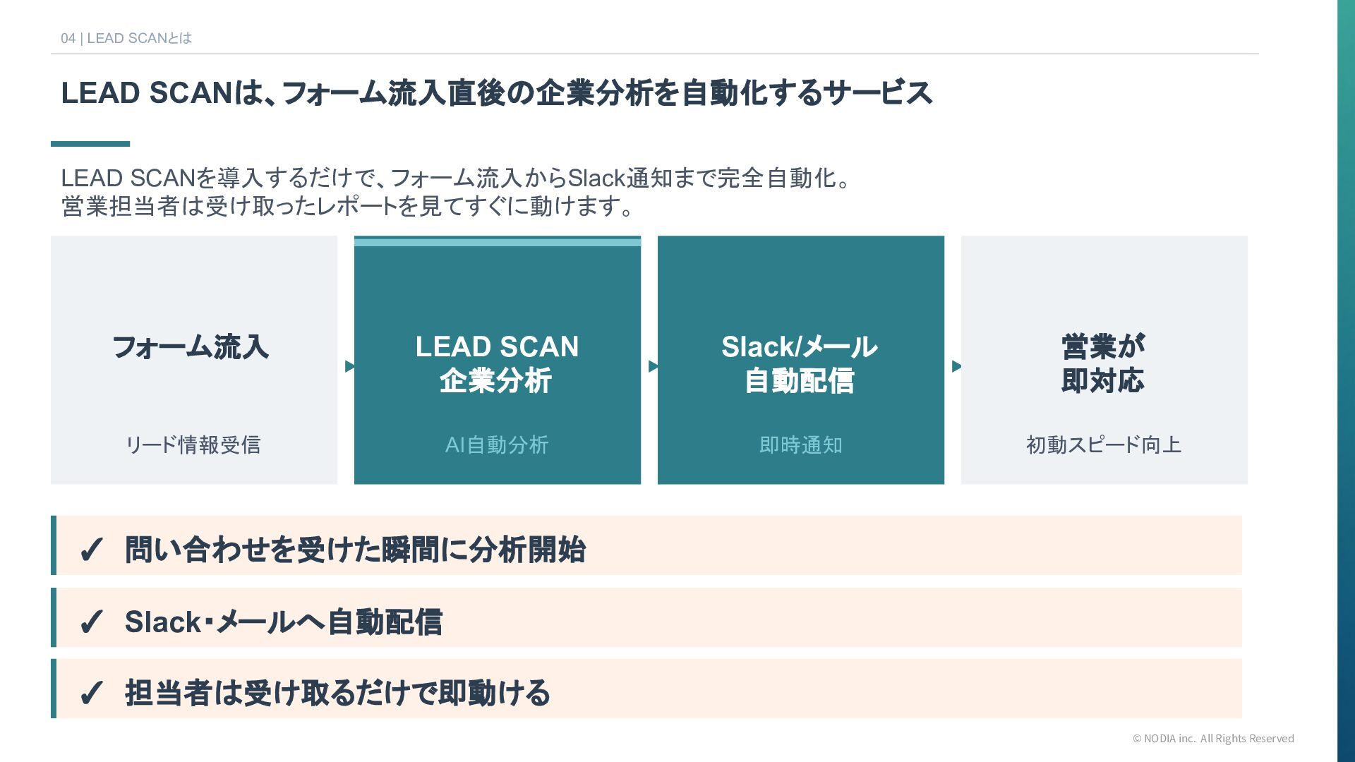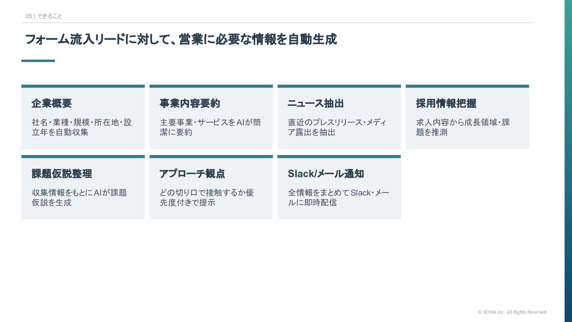 フォーム流入リードをAIで自動分析し、企業概要や事業内容、ニュース、課題仮説まで整理してSlack・メールに即時共有するサービスです。営業担当の調査負荷を減らし、素早い初回対応を支援します。
