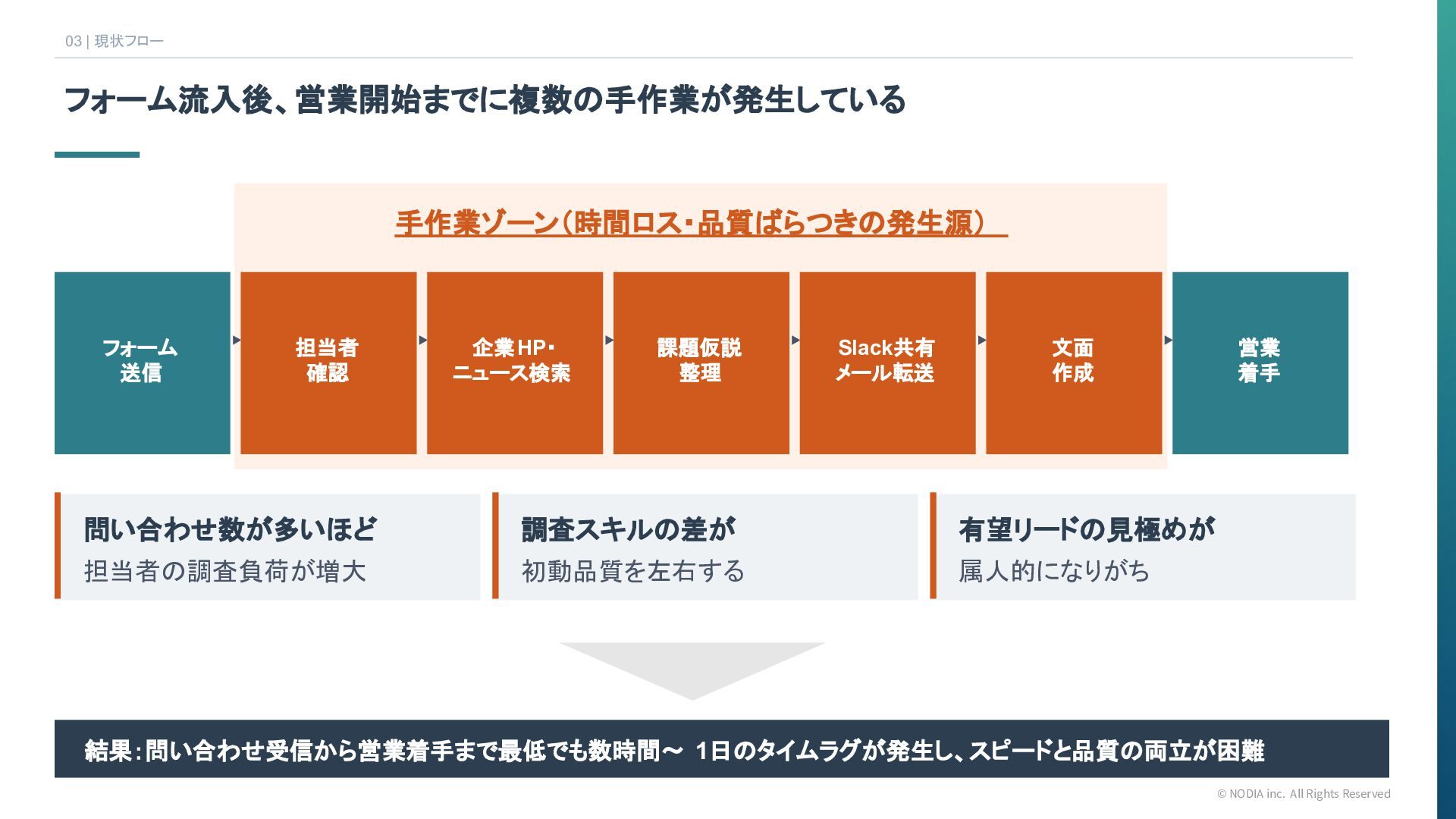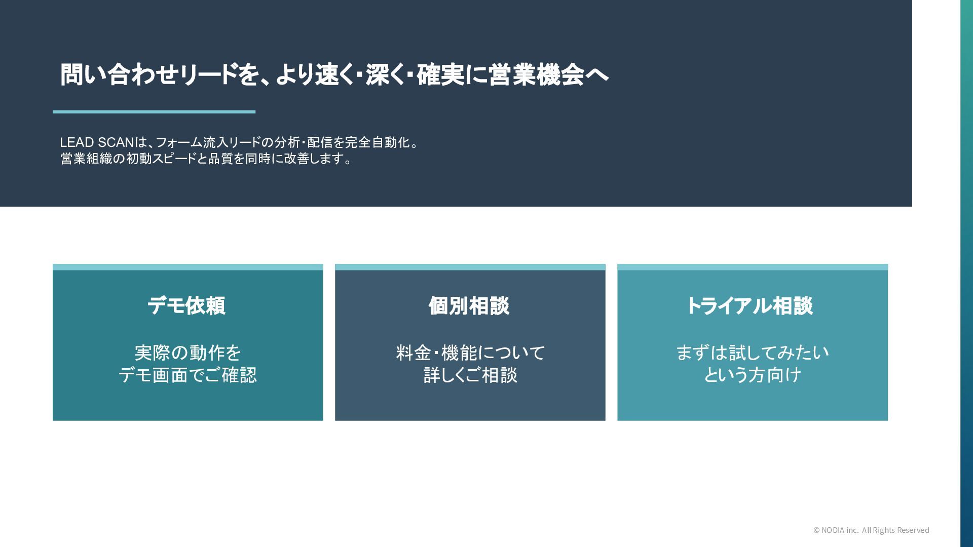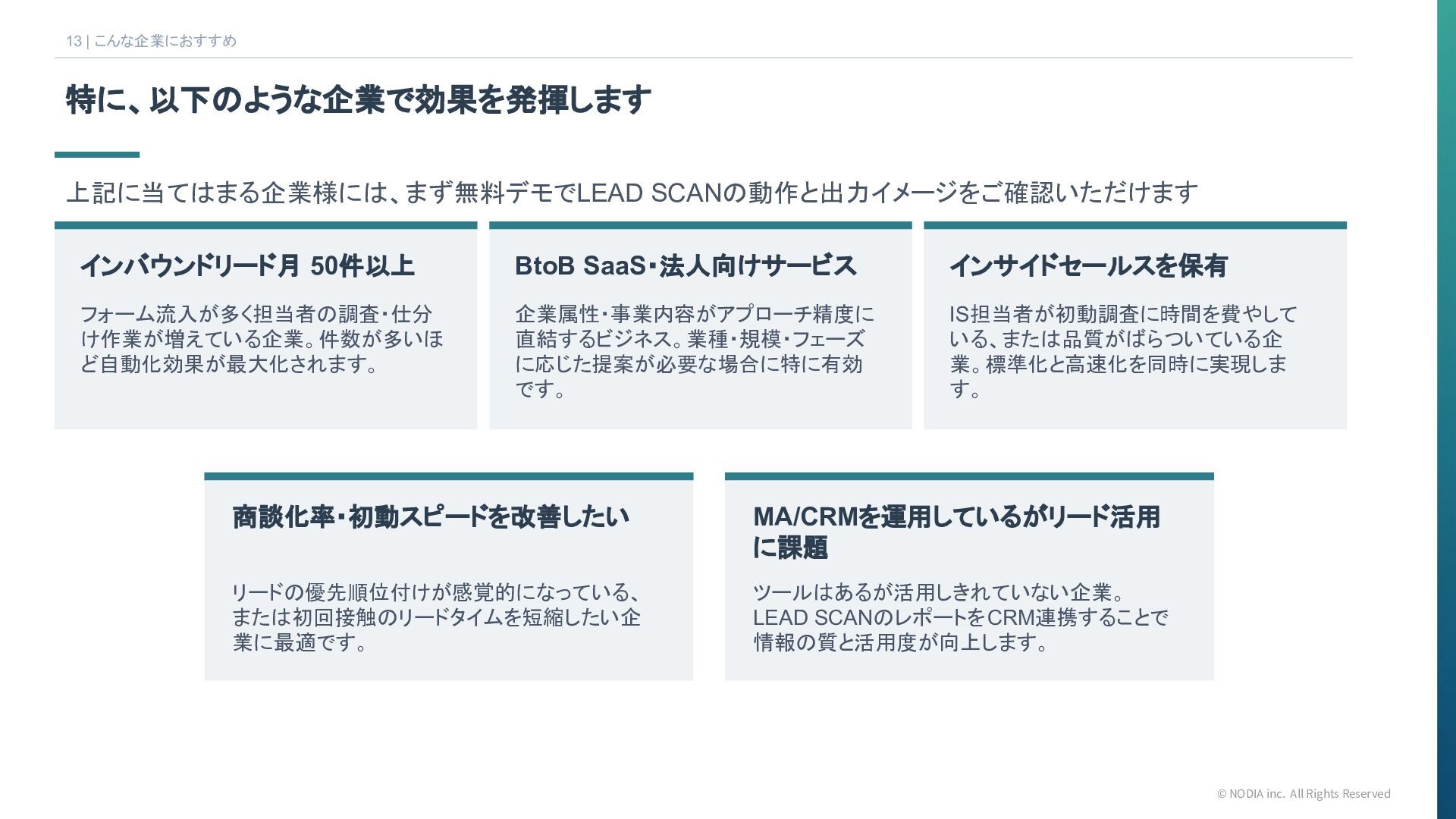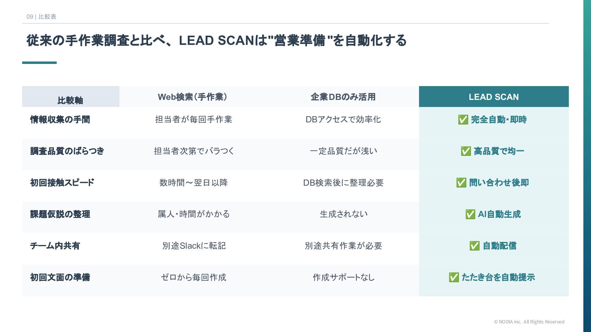 フォーム流入リードをAIで自動分析し、企業概要や事業内容、ニュース、課題仮説まで整理してSlack・メールに即時共有するサービスです。営業担当の調査負荷を減らし、素早い初回対応を支援します。